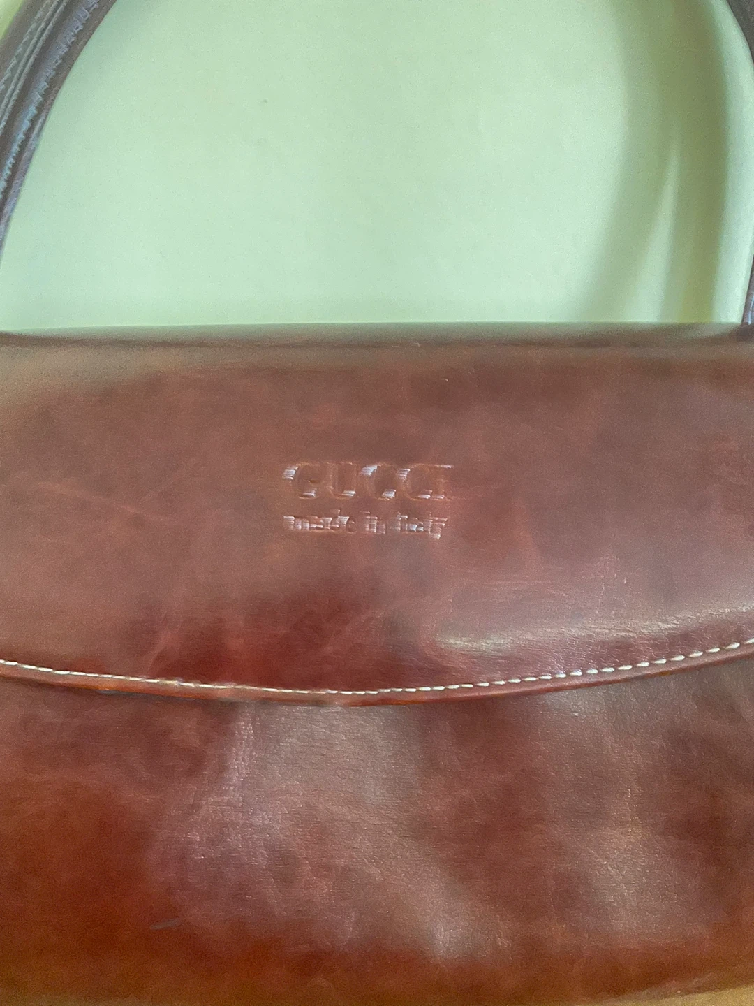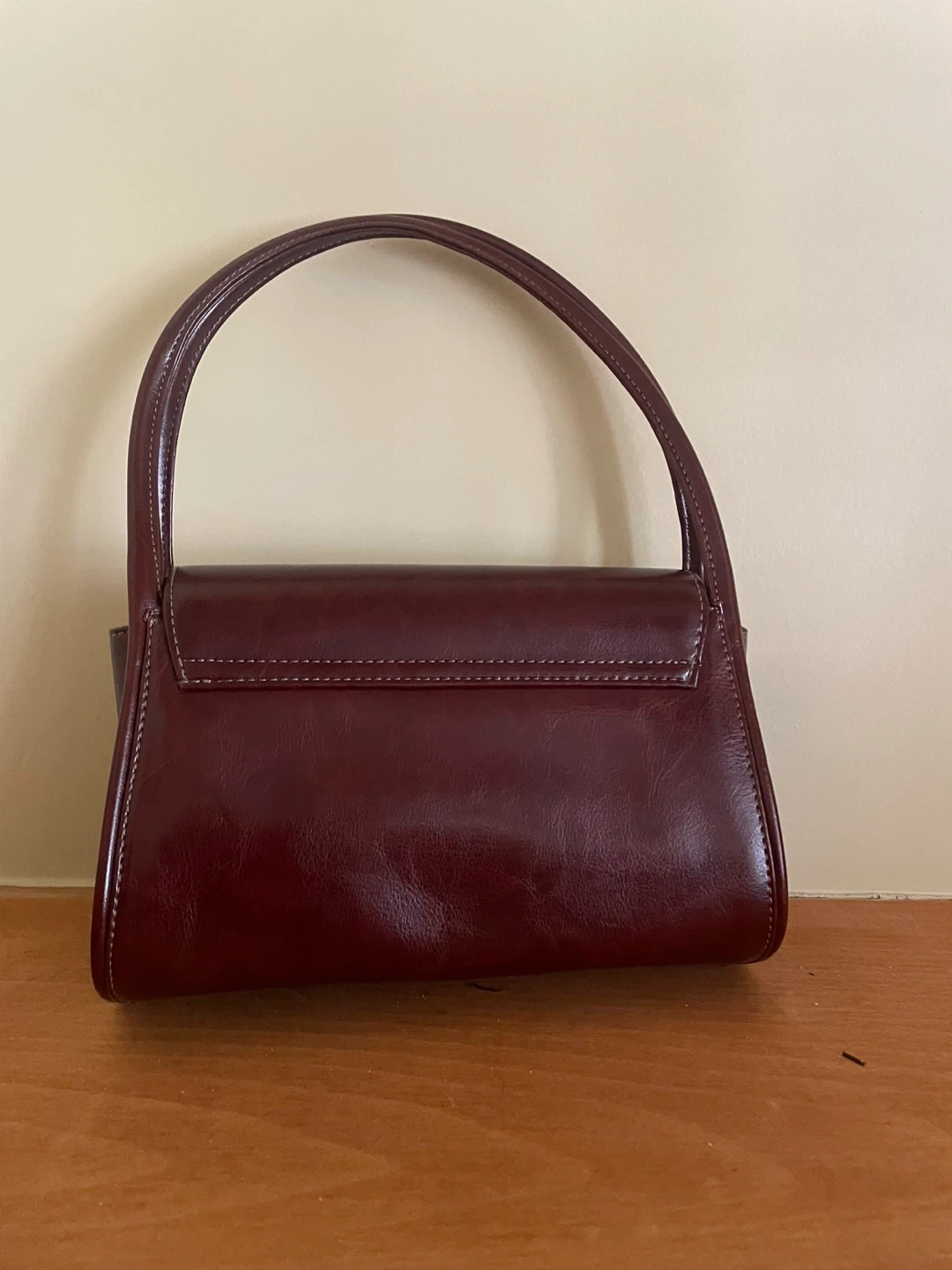 A stylish Gucci shoulder bag in a deep burgundy colour. It's made from smooth, glossy leather and features a classic flap closure with a subtle embossed logo. The interior is lined and includes a zippered pocket. This bag is perfect for everyday use or for a night out!