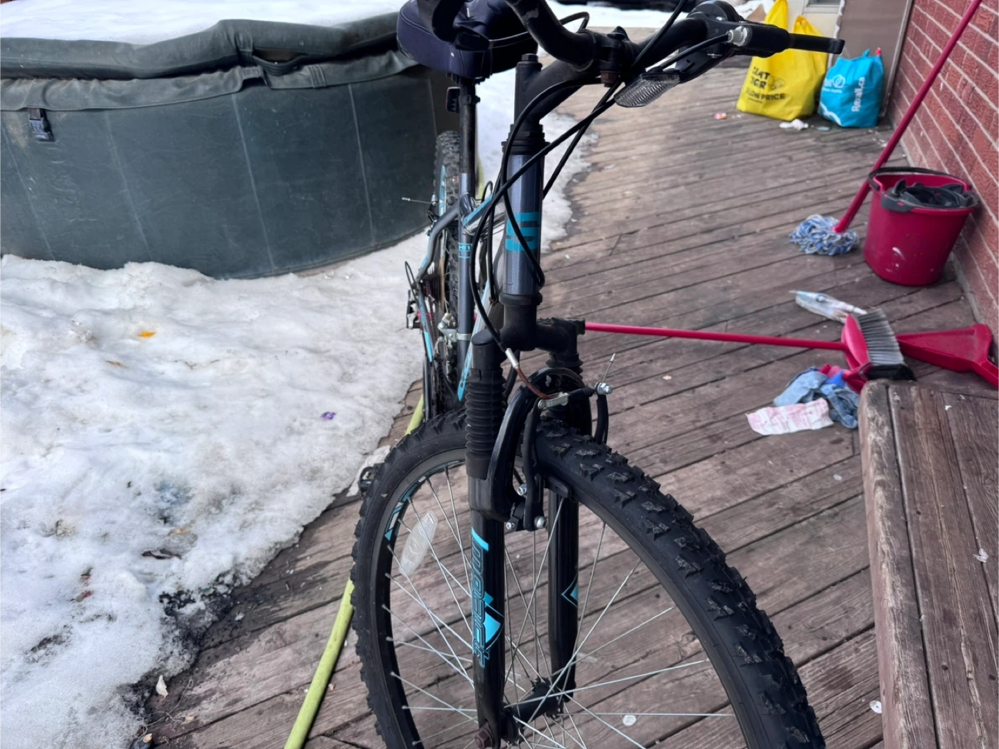 This is a Supercycle Nitro mountain bike. It features front suspension and a comfortable padded seat. Great for trails and everyday rides!