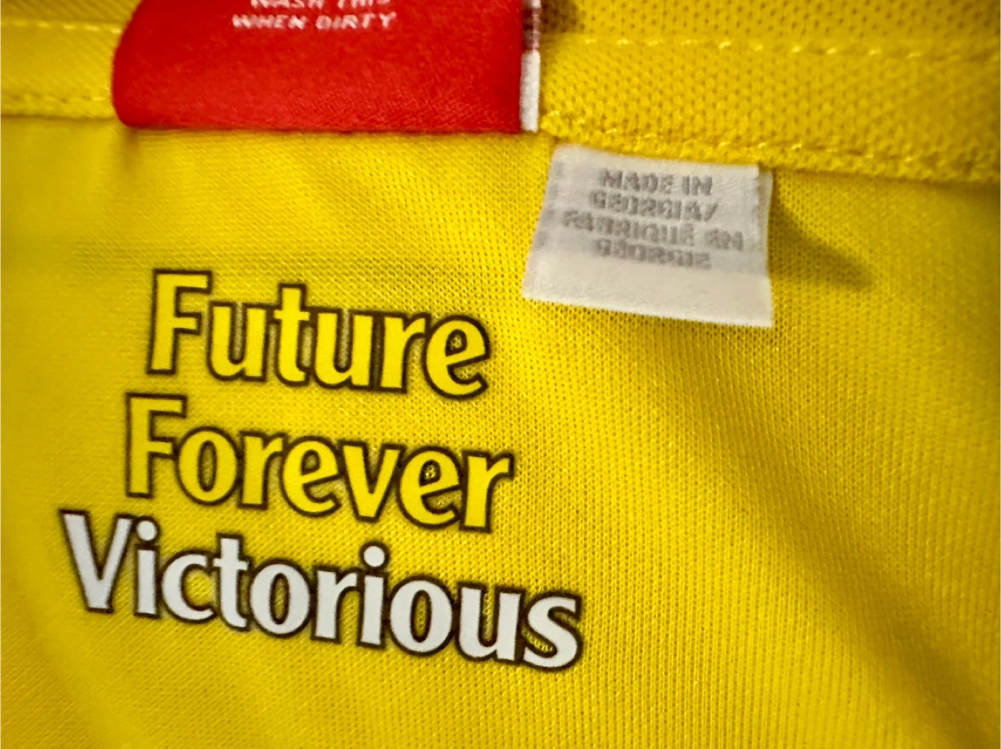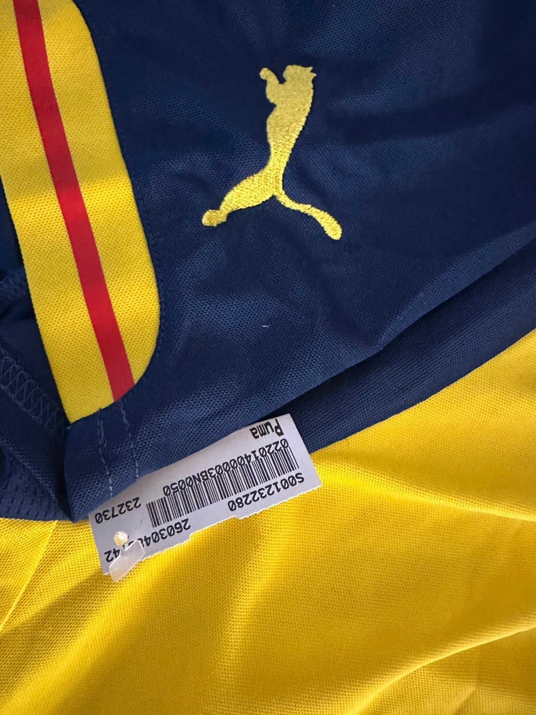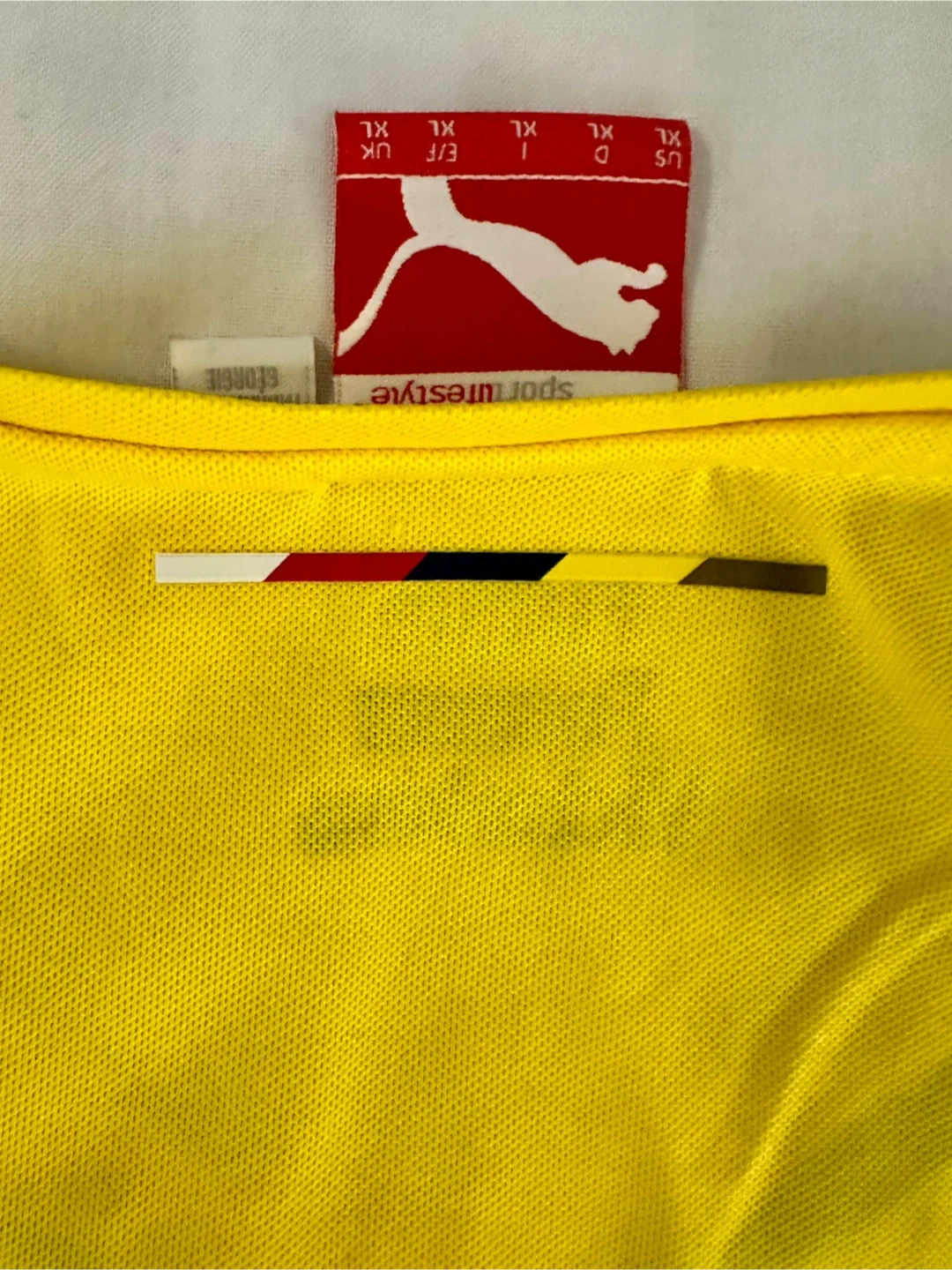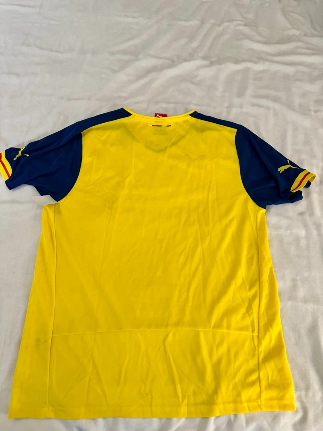 Yellow short-sleeve Puma football jersey for Arsenal FC. It's a size XL with the 'Fly Emirates' sponsor. Made in Georgia.