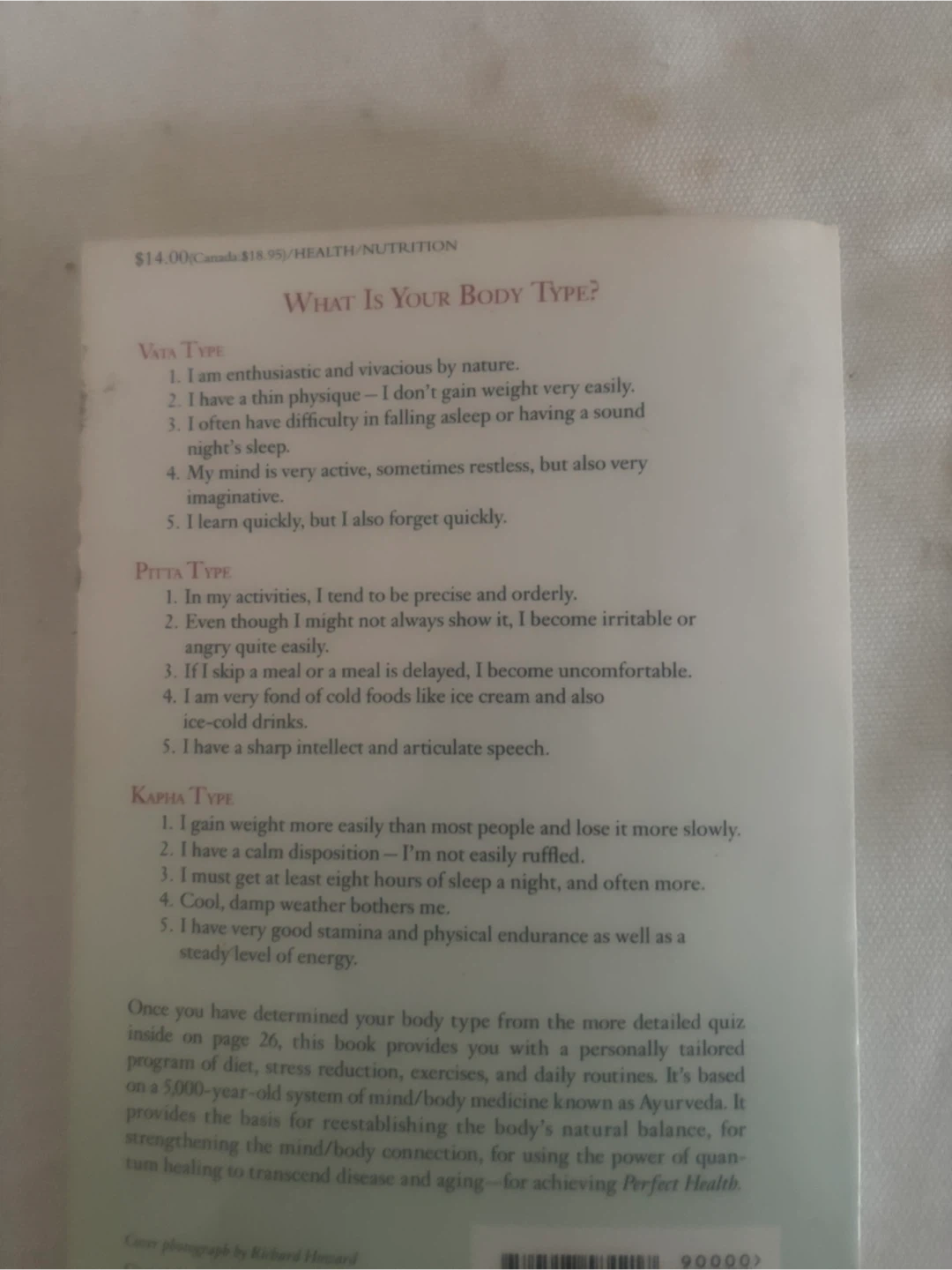 This book, "Perfect Health: The Complete Mind/Body Guide," is written by Deepak Chopra, M.D. It provides information on mind-body connection, stress reduction, and daily routines based on Ayurveda. The book includes quizzes to determine your body type and offers personalized guidance for re-establishing balance.