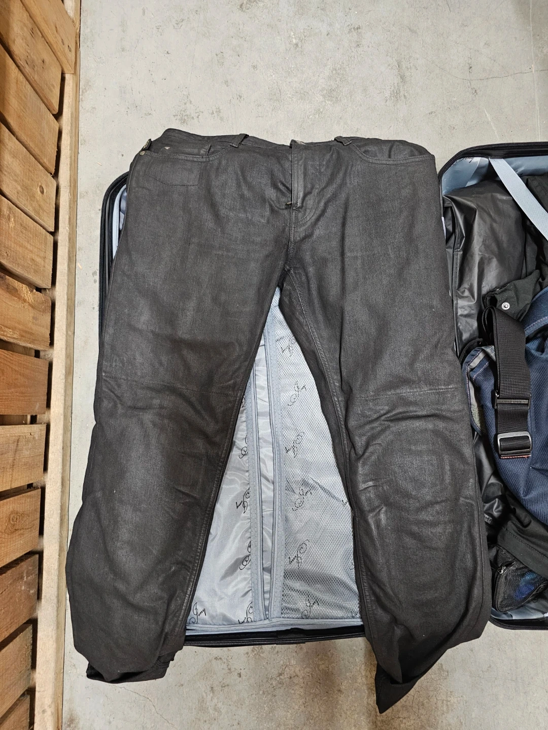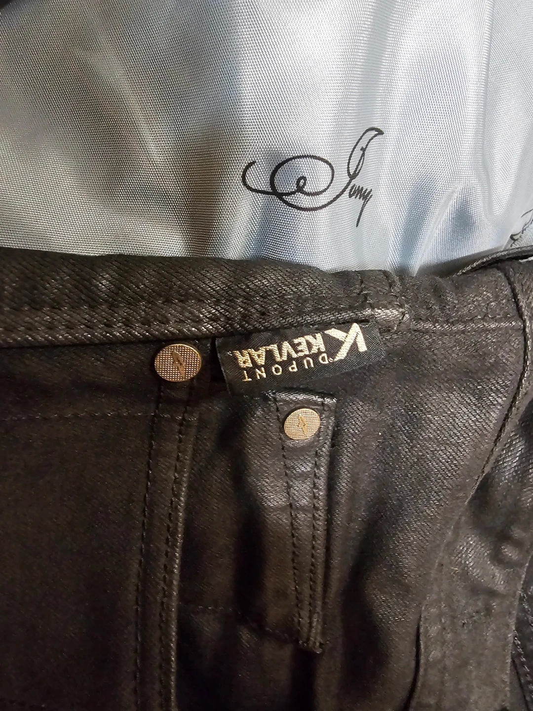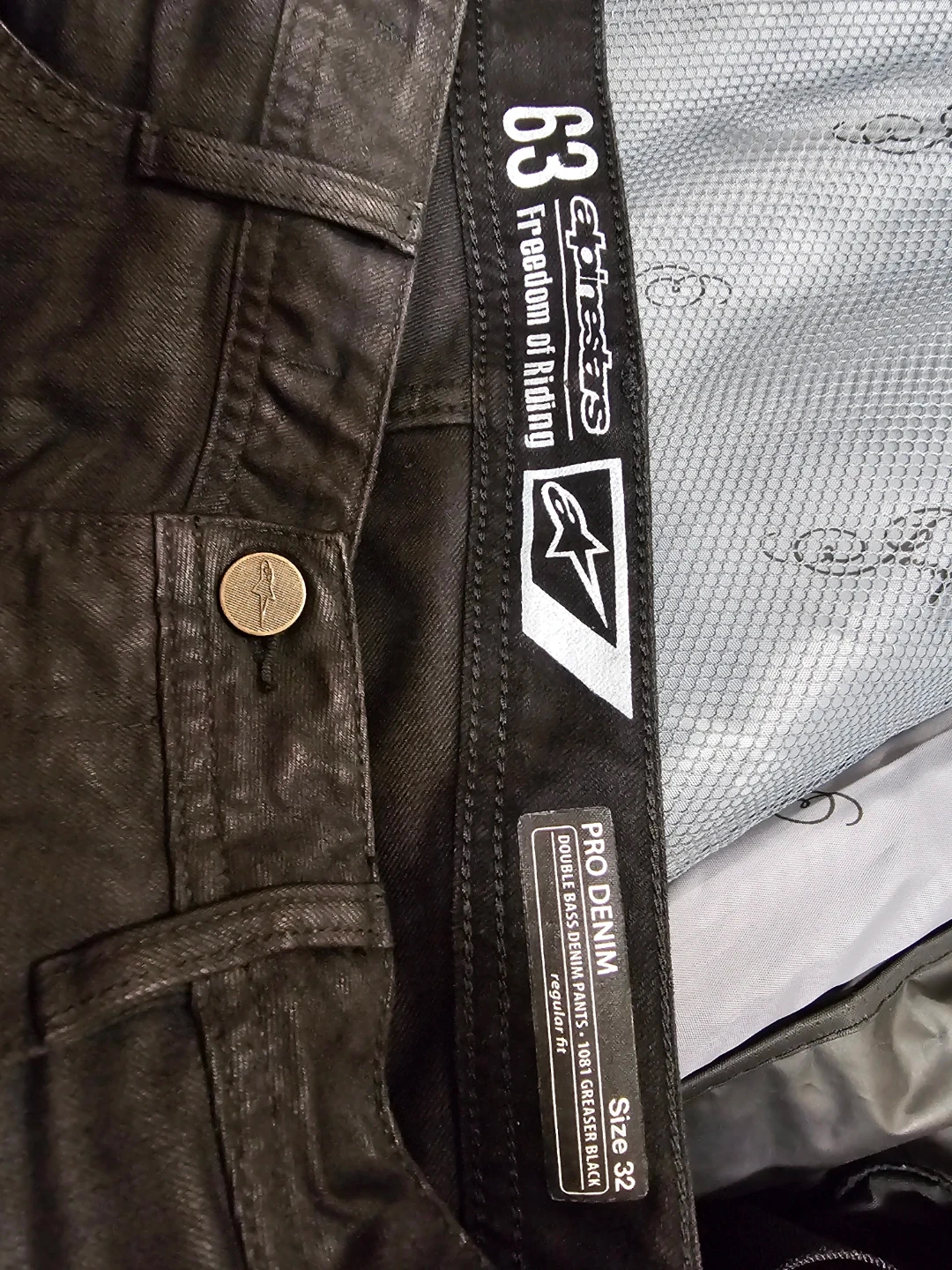 These are Alpinestars Pro Denim motorcycle pants in colour 1081 Grease Black. They are size 32 with a regular fit. The pants are made with Dupont Kevlar for added protection. These pants are suitable for motorcycle riding.