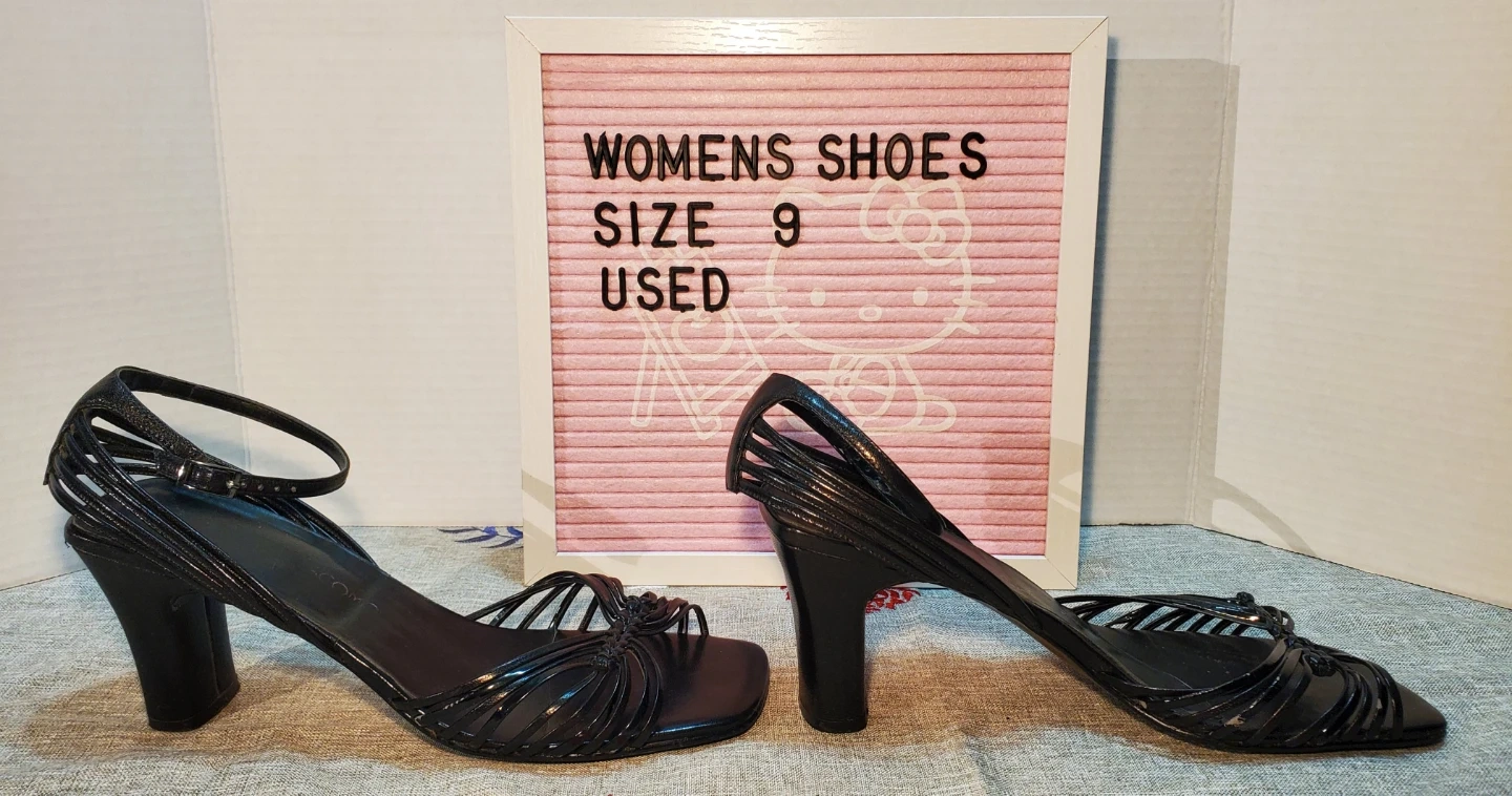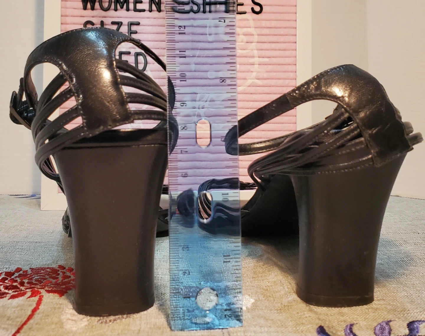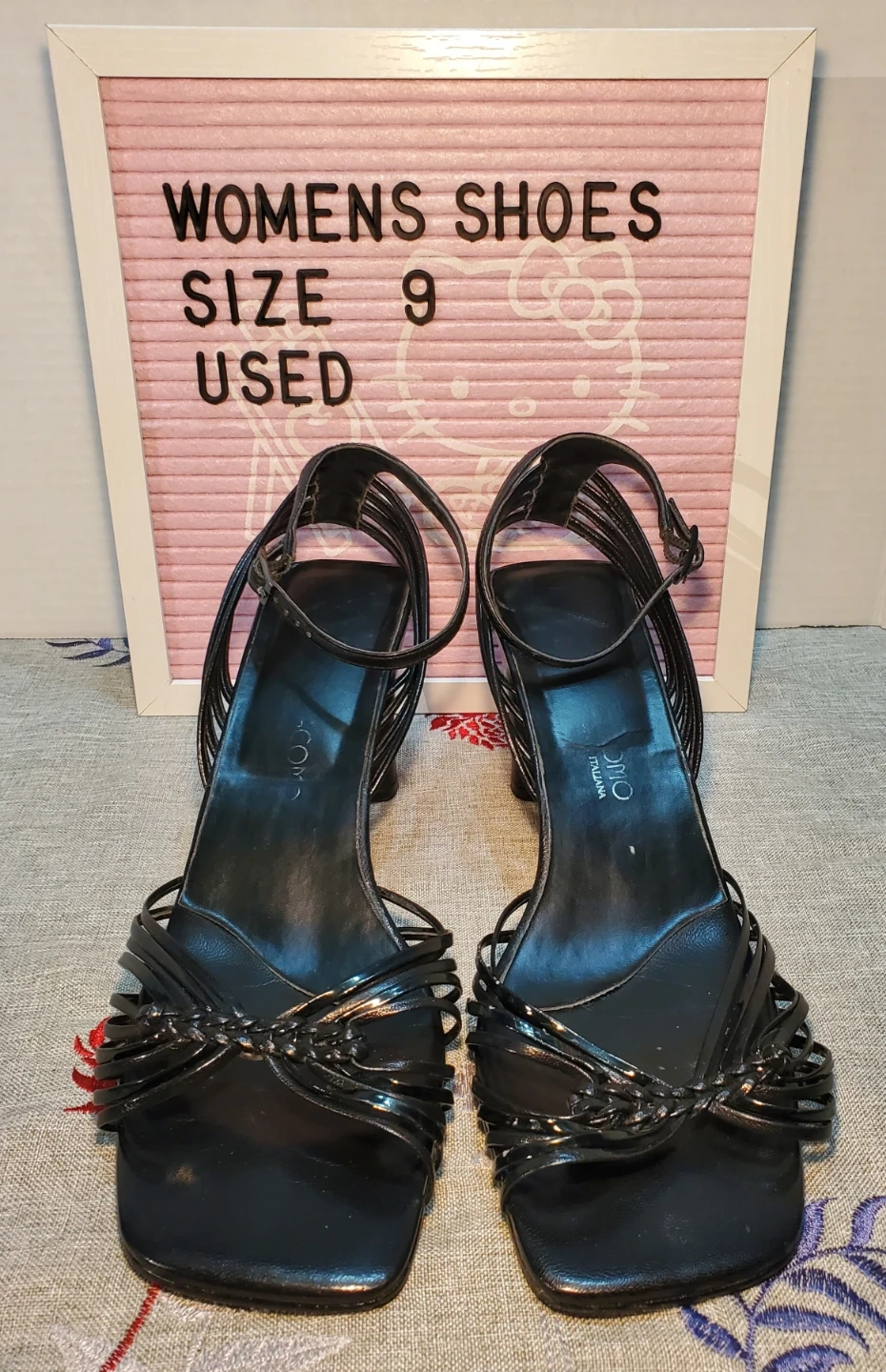 These are leather and made in Italy (from Veresse). Classic black heeled sandals with a strappy design. Size 9 women's. These feature a comfortable heel height for extended wear. Perfect for dressing up an outfit!