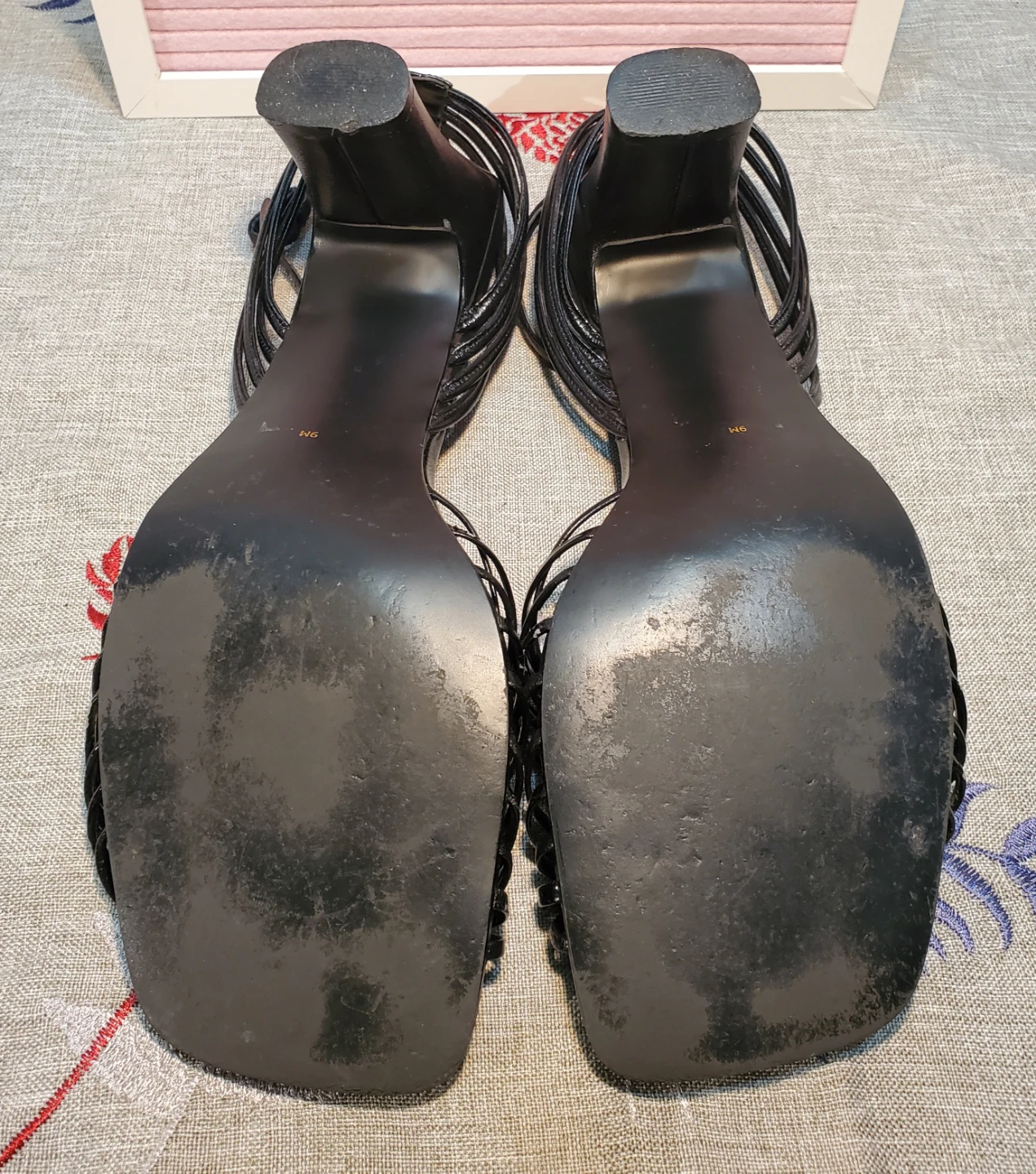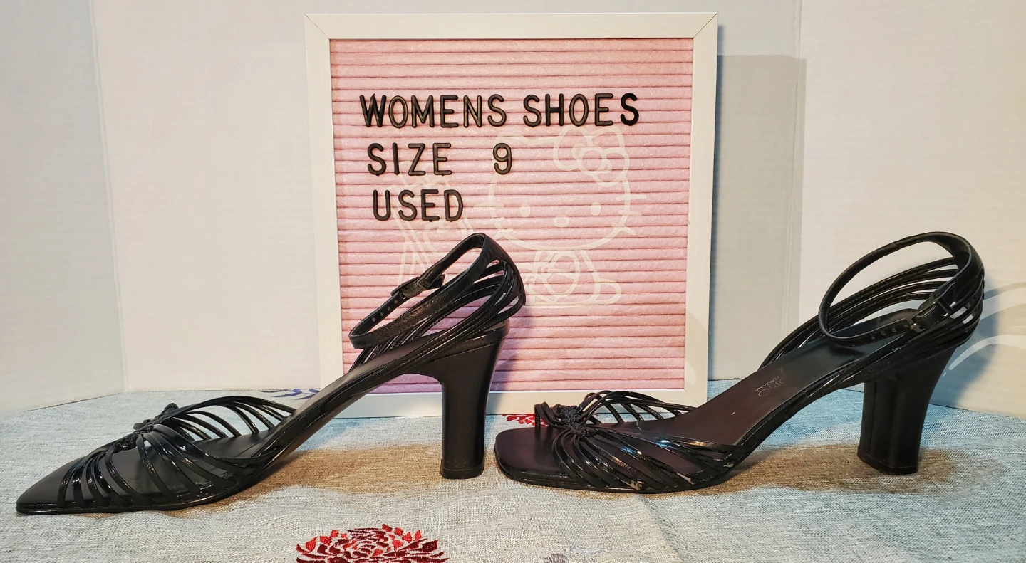 These are leather and made in Italy (from Veresse). Classic black heeled sandals with a strappy design. Size 9 women's. These feature a comfortable heel height for extended wear. Perfect for dressing up an outfit!