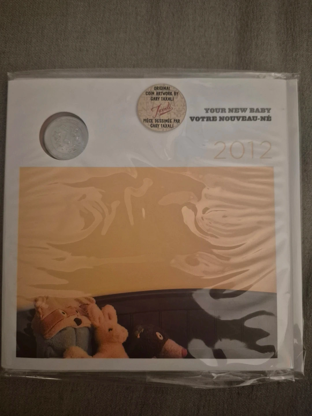 This is a 2012 Royal Canadian Mint coin set celebrating a new baby. It includes several Canadian coins, likely from the year of issue. The set features original coin artwork by Gary Taxali.