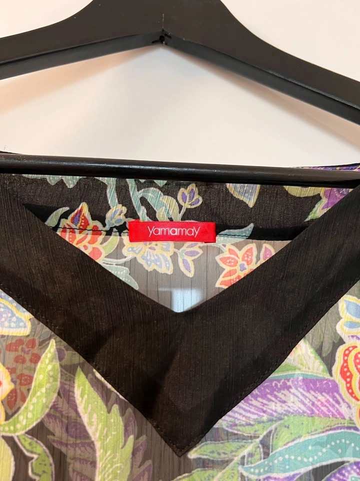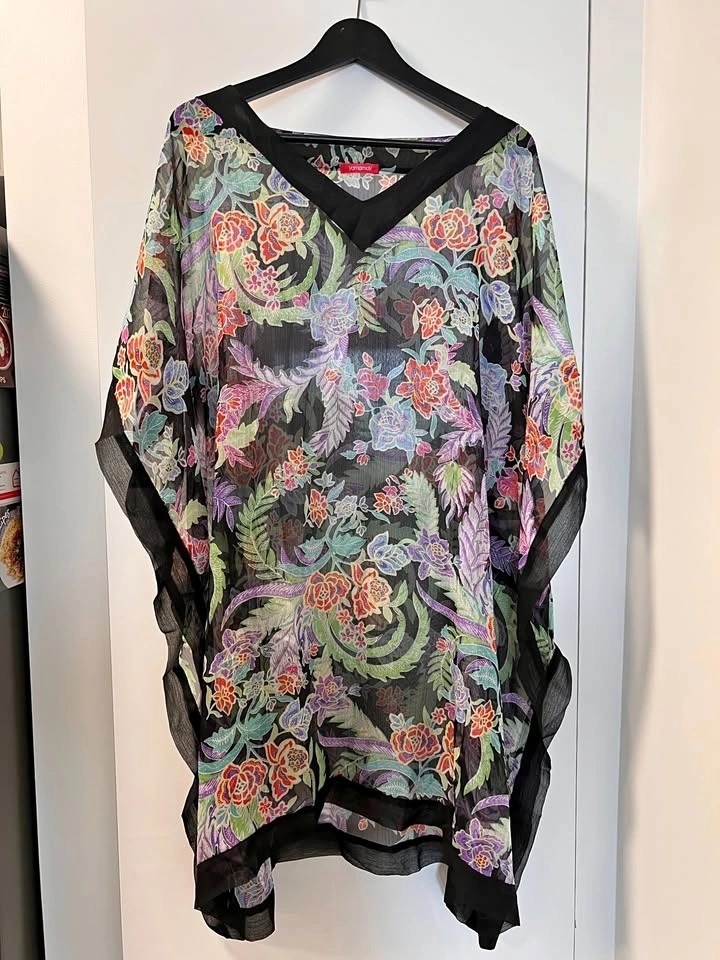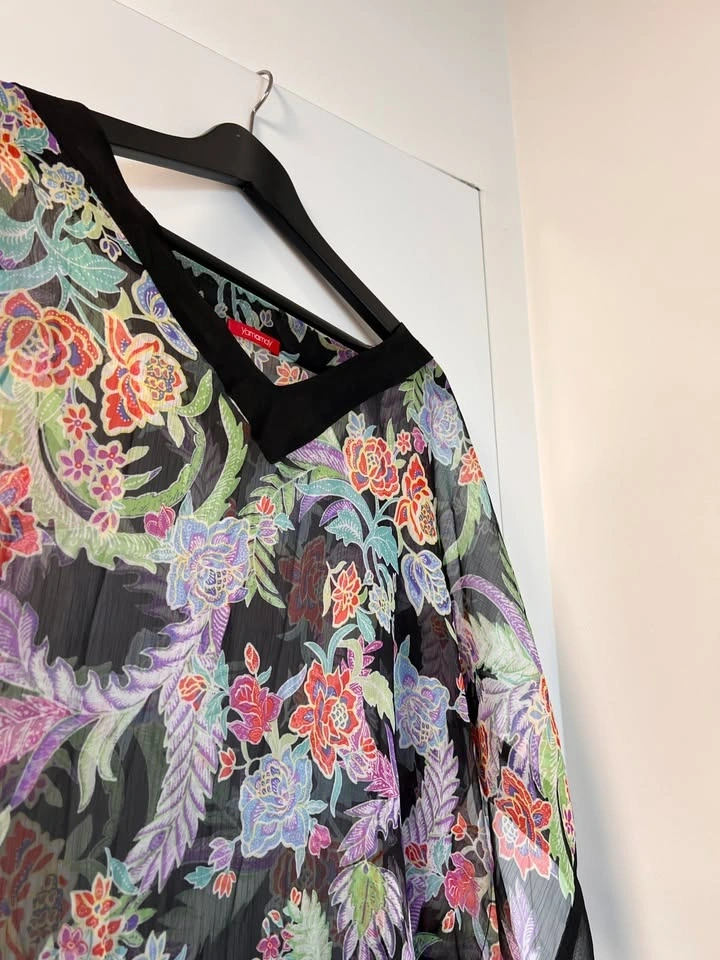 Features a black background with a beautiful floral pattern in grey, pink, red, aqua blue, and purple. Can also be styled as a sheer top or tunic.
