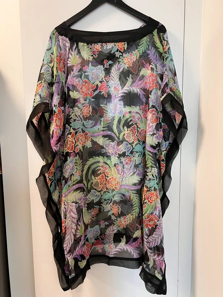 Features a black background with a beautiful floral pattern in grey, pink, red, aqua blue, and purple. Can also be styled as a sheer top or tunic.