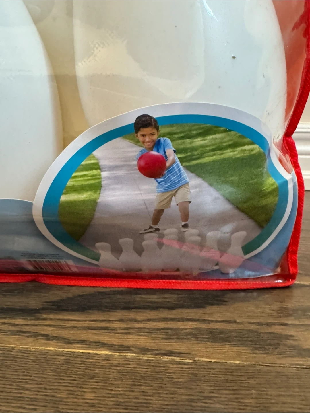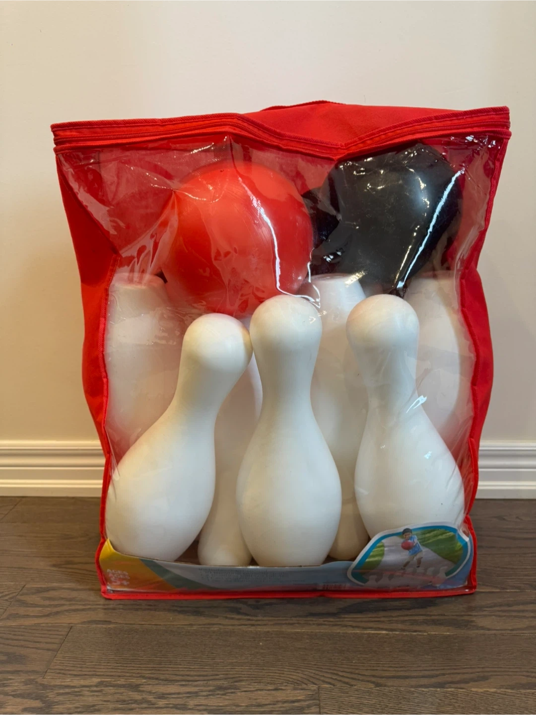 This is a kids bowling set with six white pins and a red bowling ball. It comes in a red zippered bag for easy storage and transport. This set is great for indoor or outdoor play!