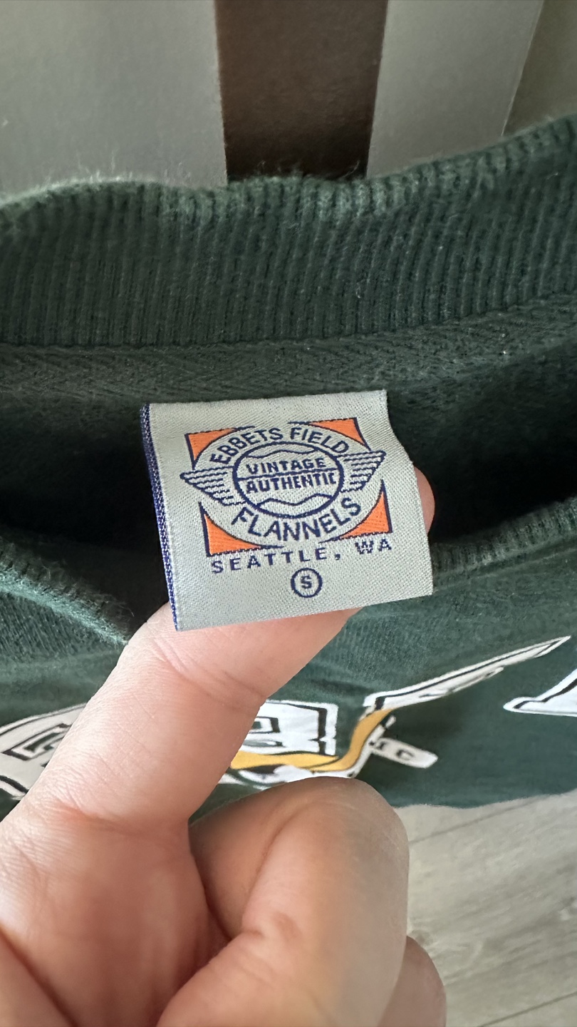 Selling a vintage Ebbets Field Flannels crewneck sweatshirt. It's a size small and made of 100% cotton. The colour is a nice dark green. Perfect for a casual, retro look!