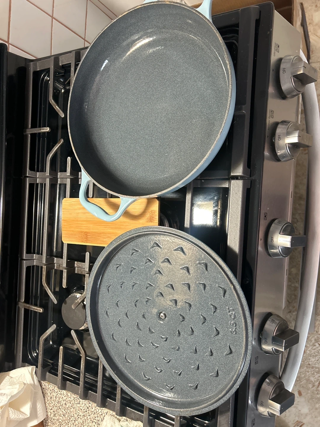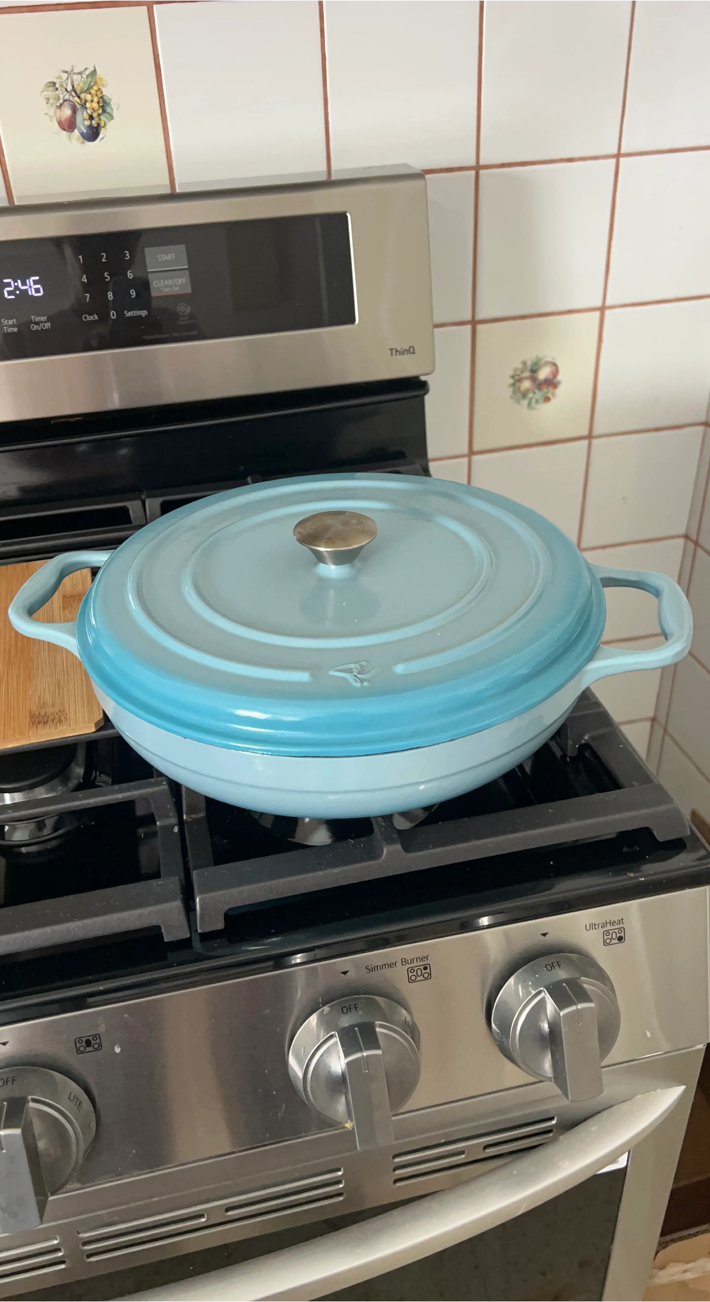 PC signature round Dutch oven in a light blue colour. It's made of cast iron and includes the lid with a gold knob. It's great for braising, roasting, and stews.