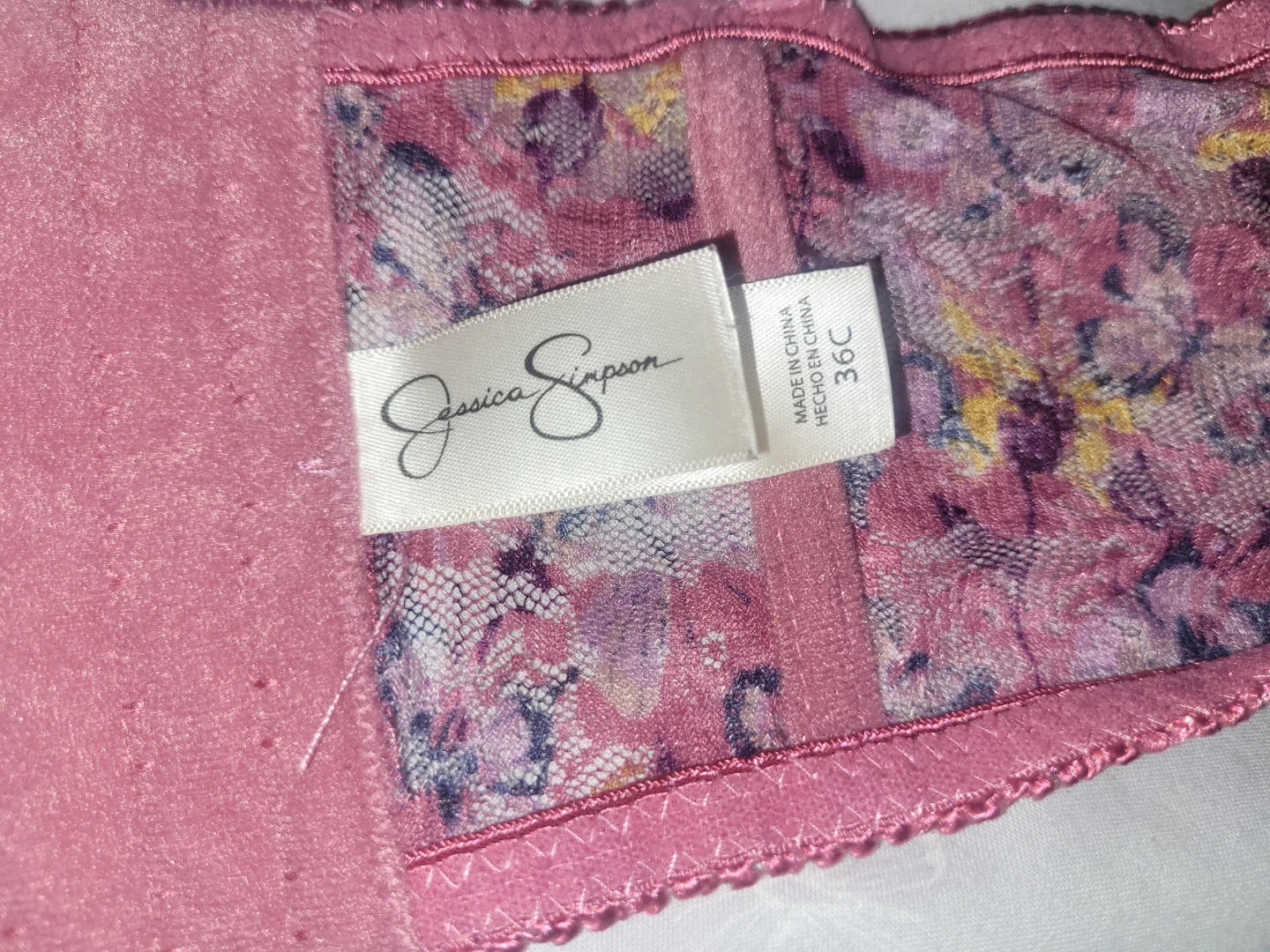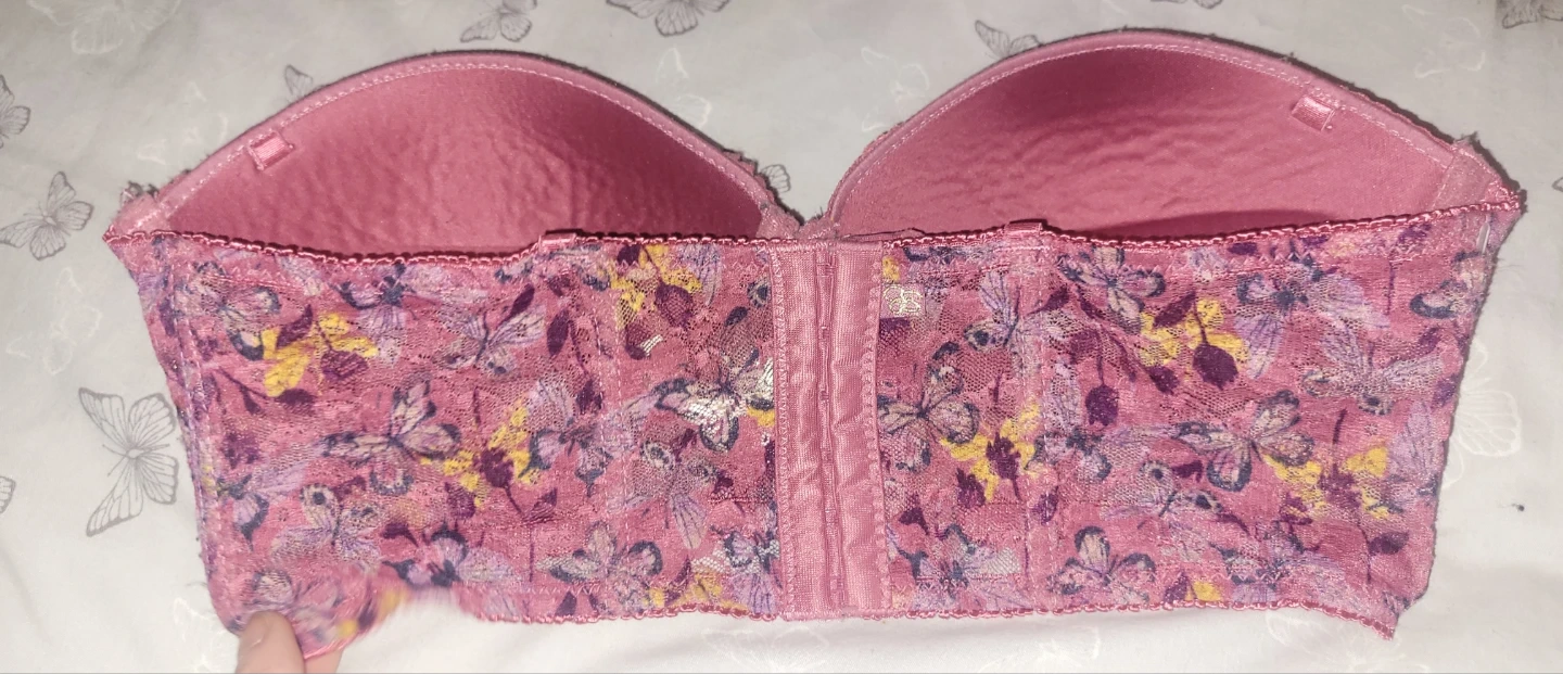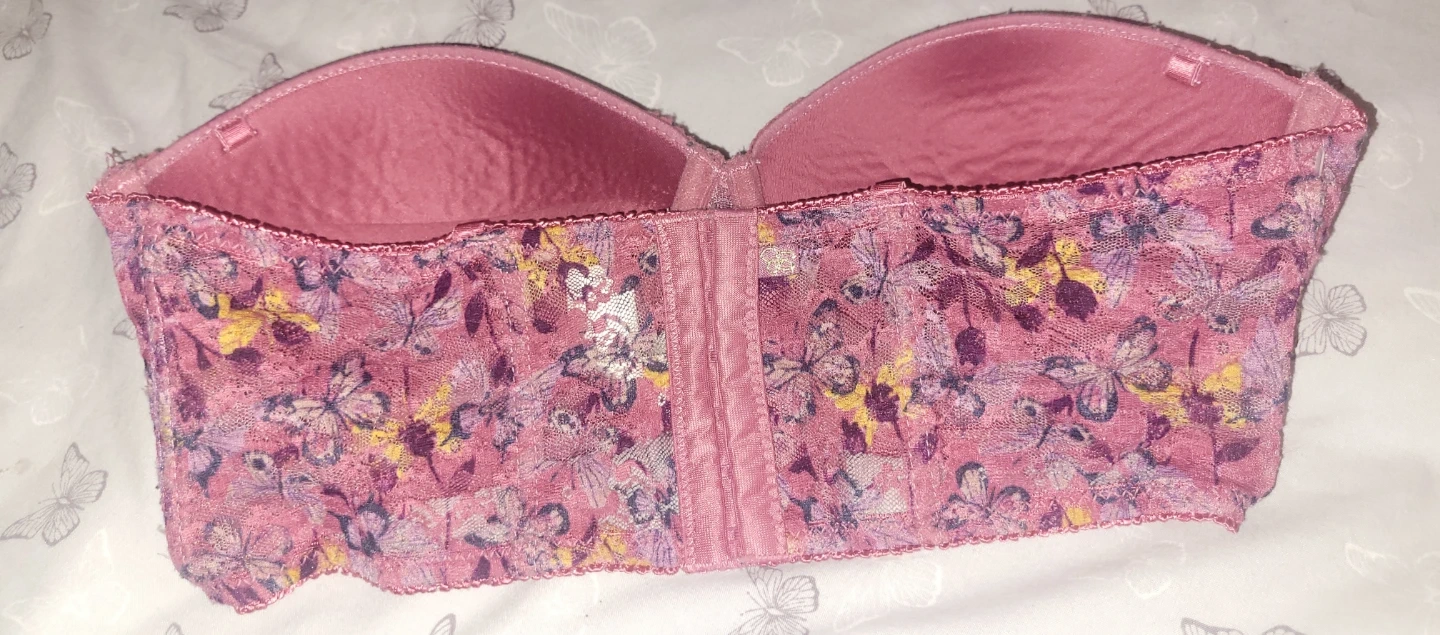 Strapless bra with a pink base and a floral butterfly lace overlay. It features a hook-and-eye closure at the back. Underwired cups offer support.