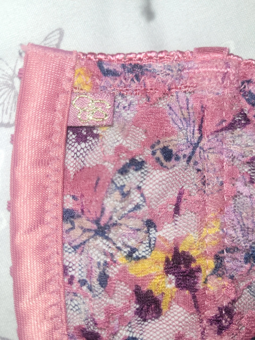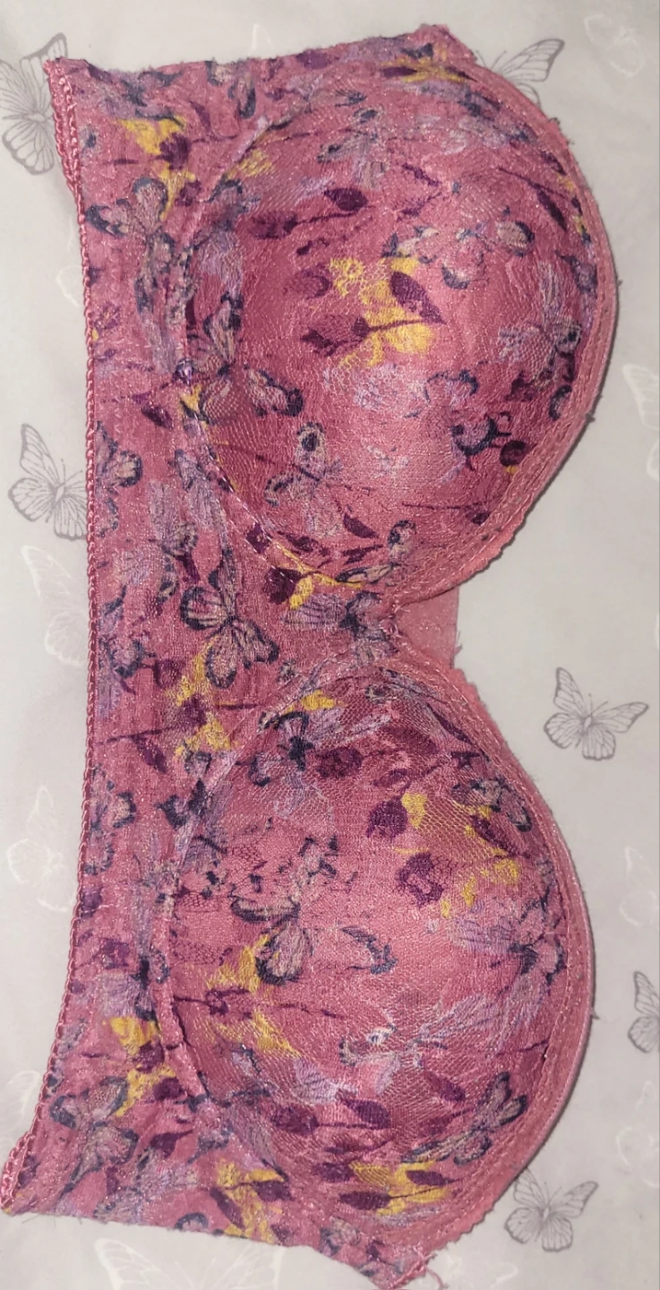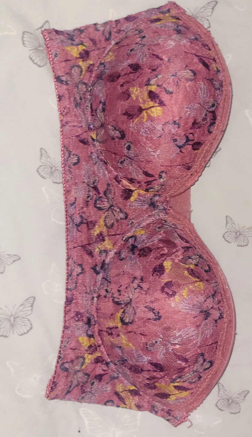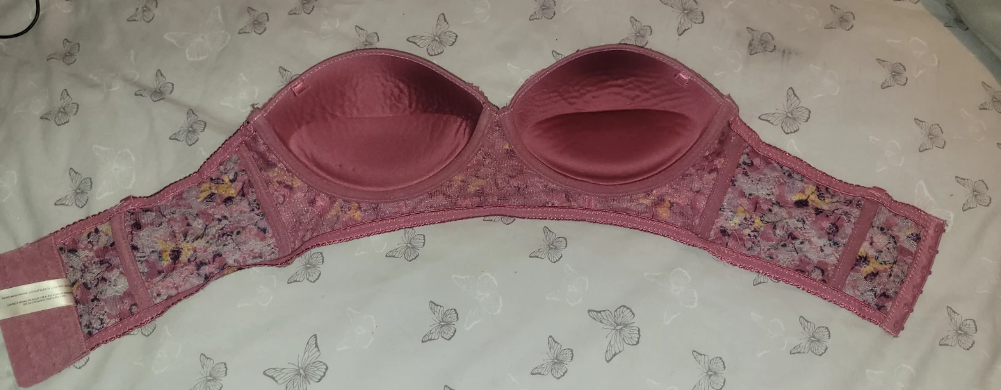 Strapless bra with a pink base and a floral butterfly lace overlay. It features a hook-and-eye closure at the back. Underwired cups offer support.