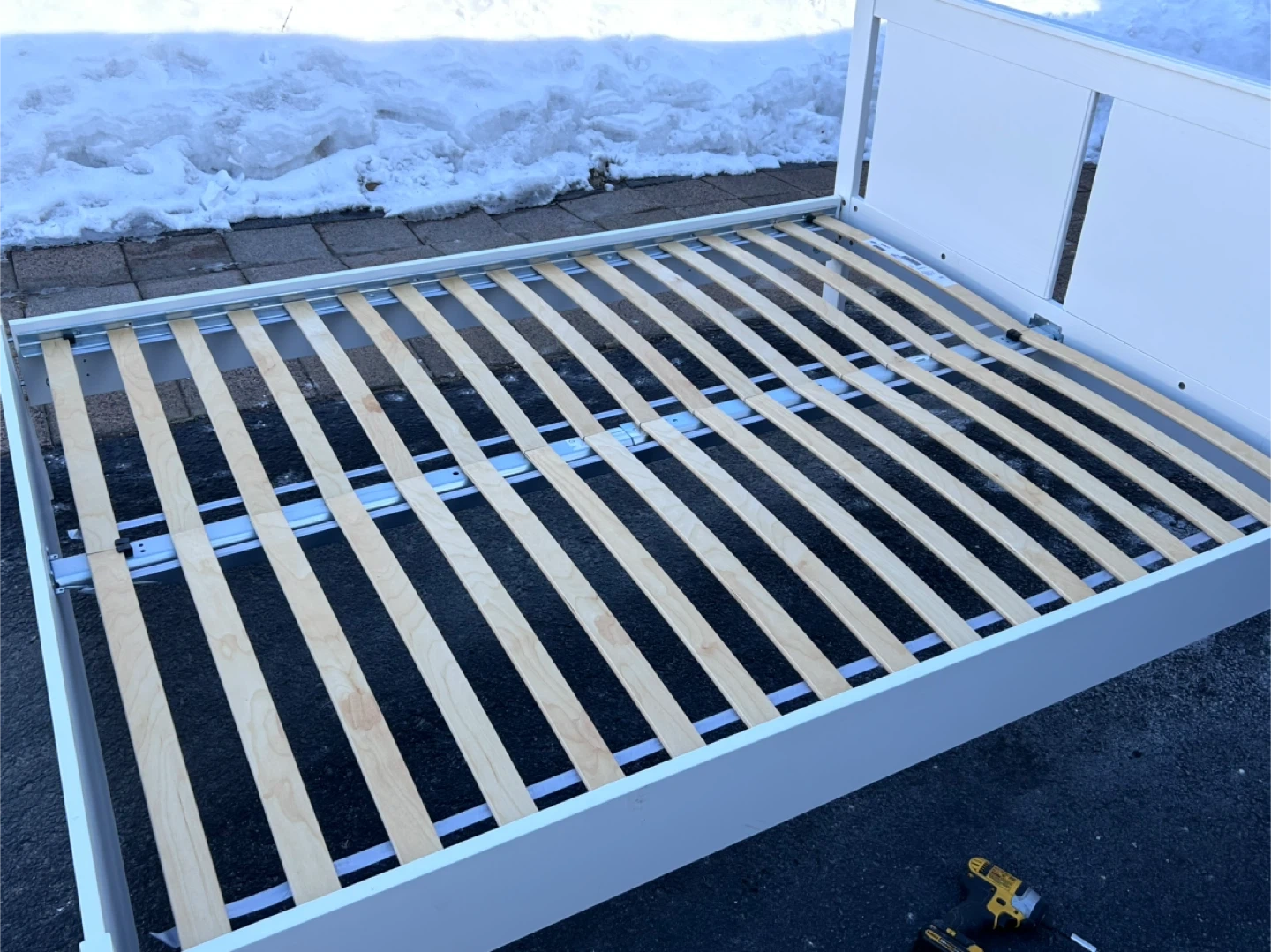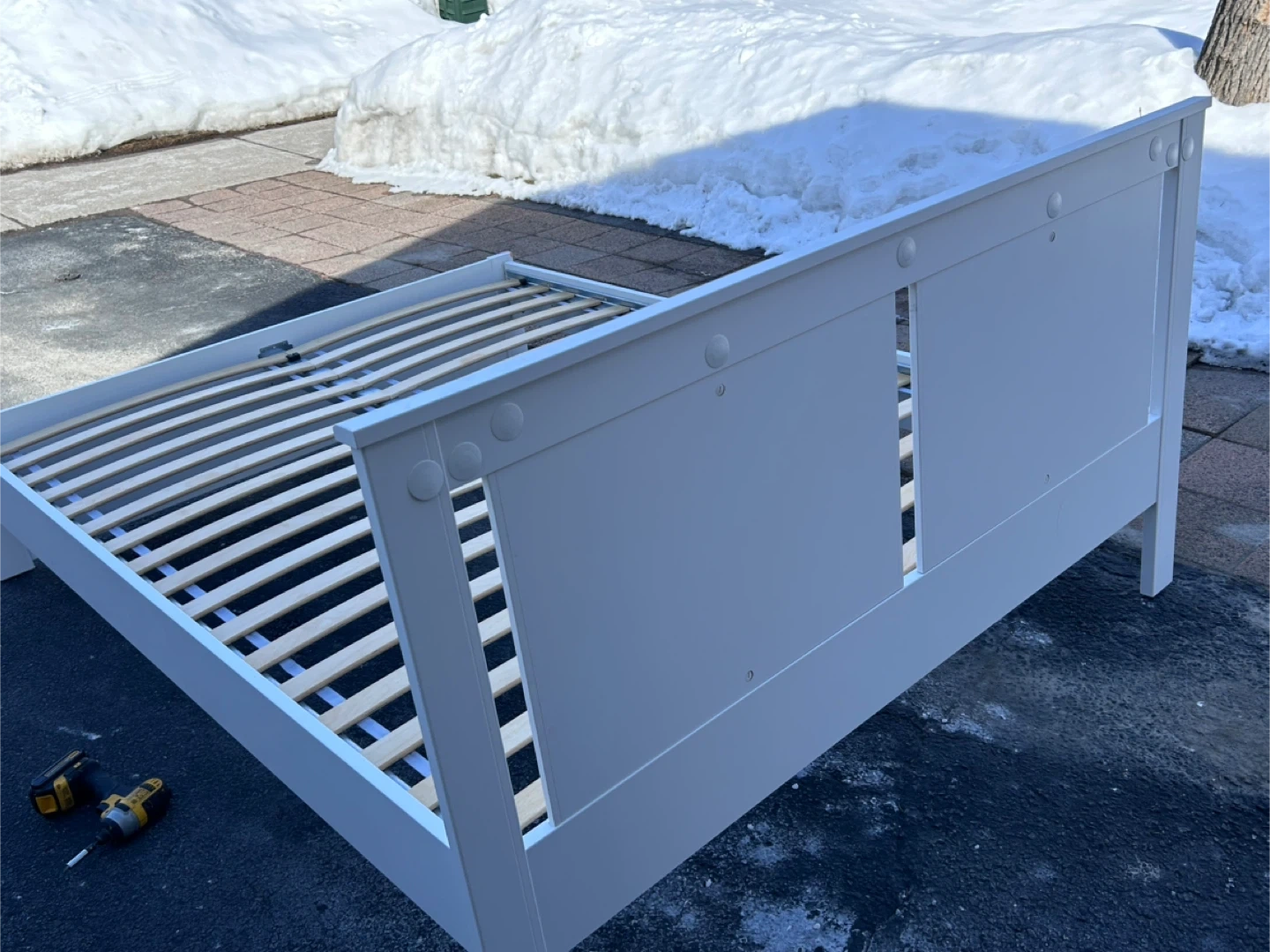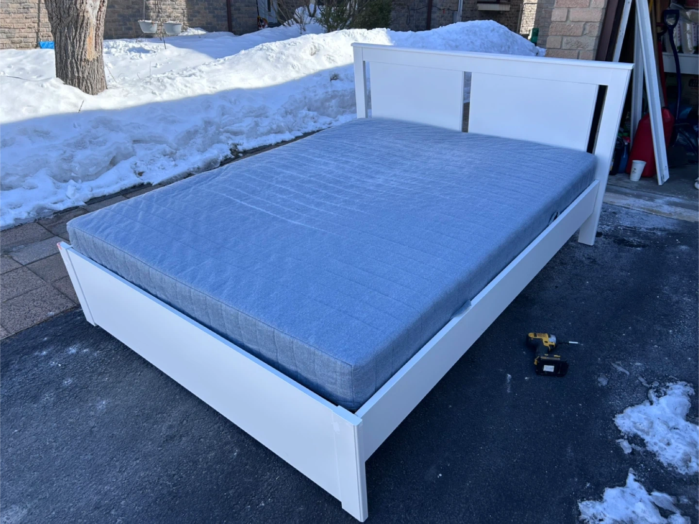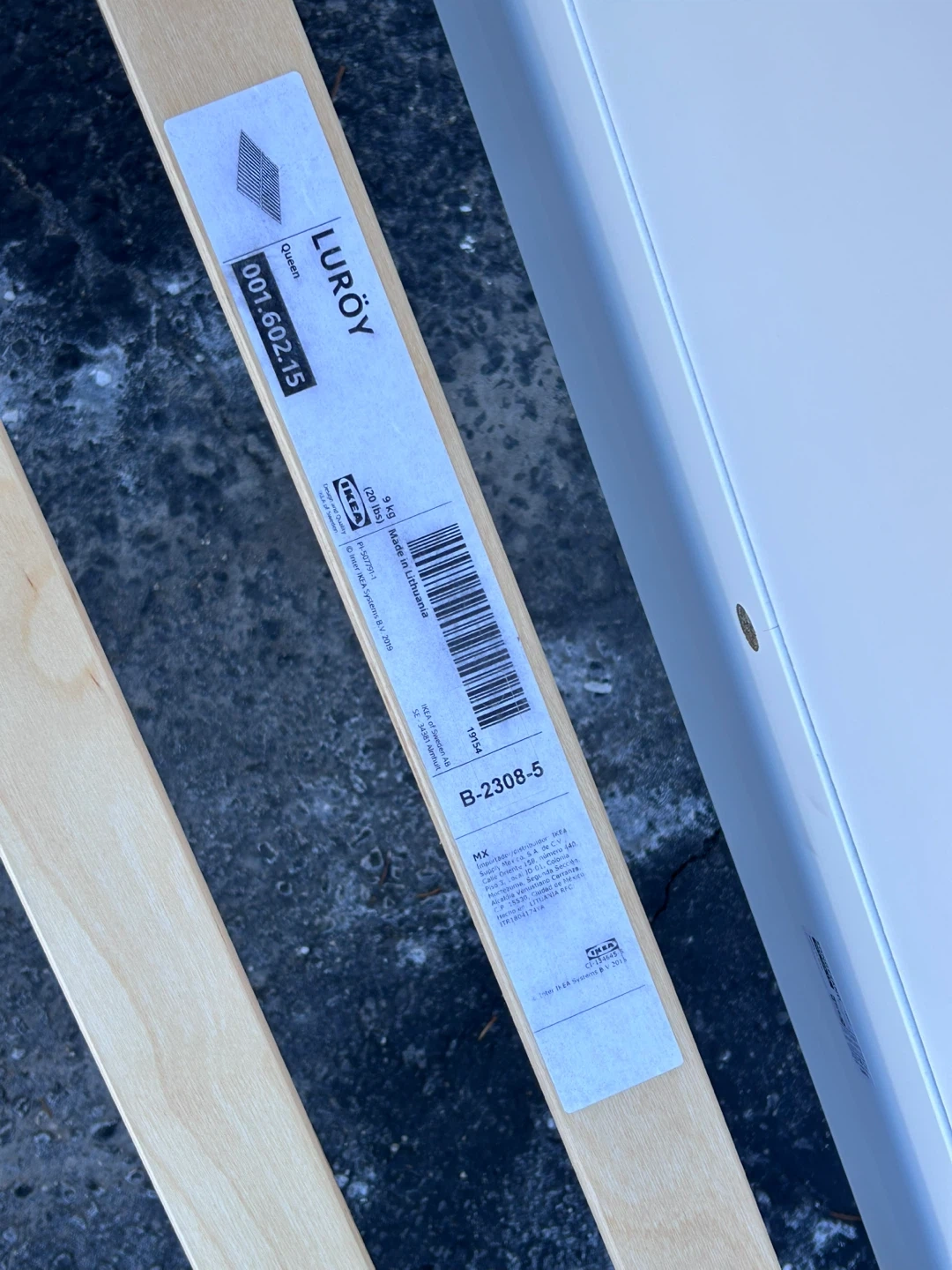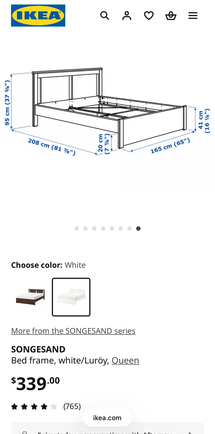 This is a white IKEA SONGESAND Queen bed frame. It includes the Luröy slatted bed base and a SKORVA center support beam. And comes with a queen mattress.