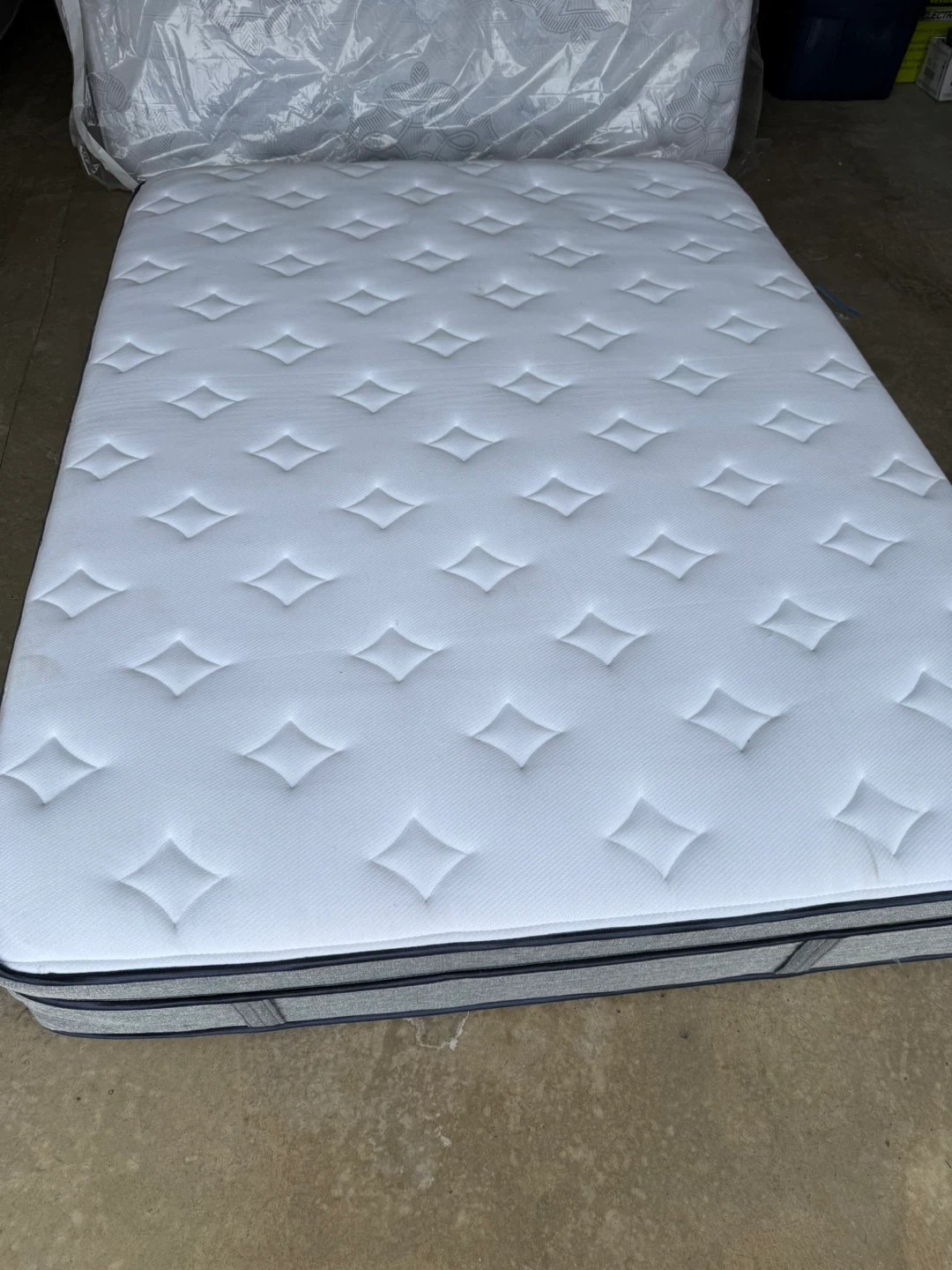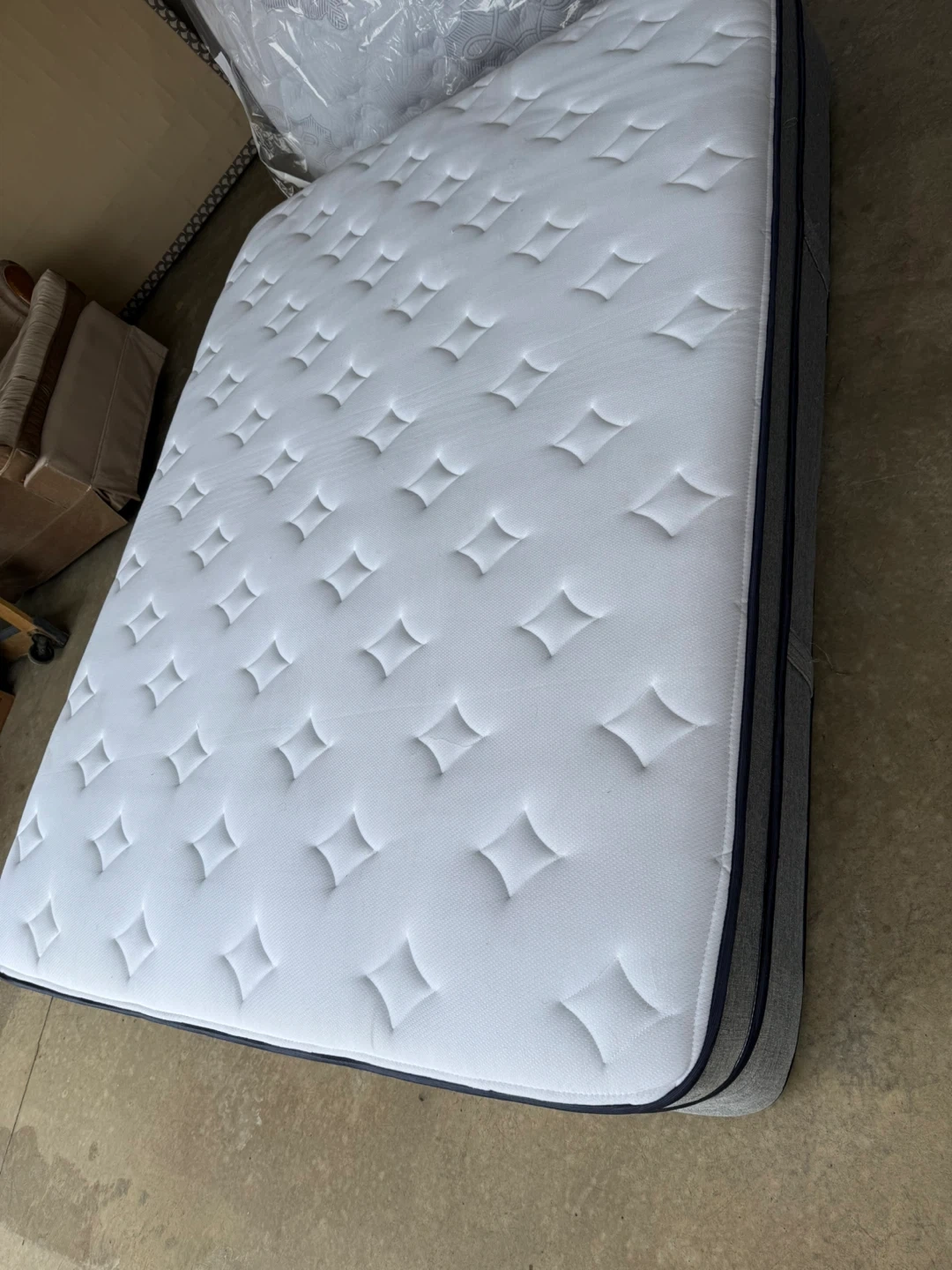 Comfortable ENDY mattress. Grey fabric sides and white quilted top. This mattress measures approximately 10 inches thick. Box spring available for extra cost pickup or delivery available for extra $$