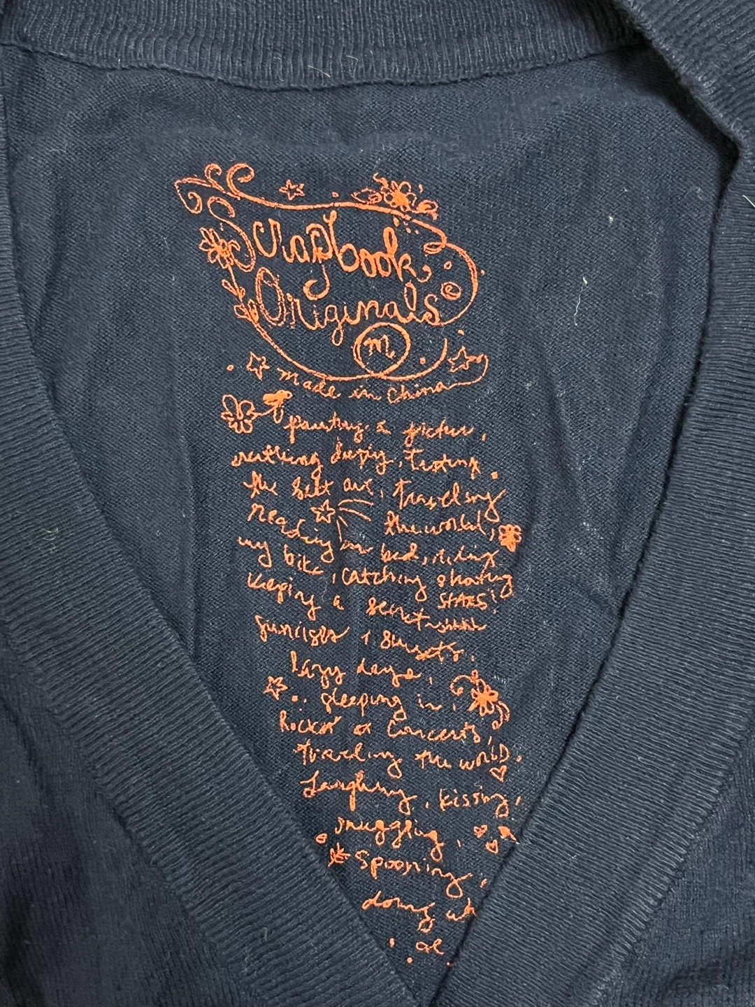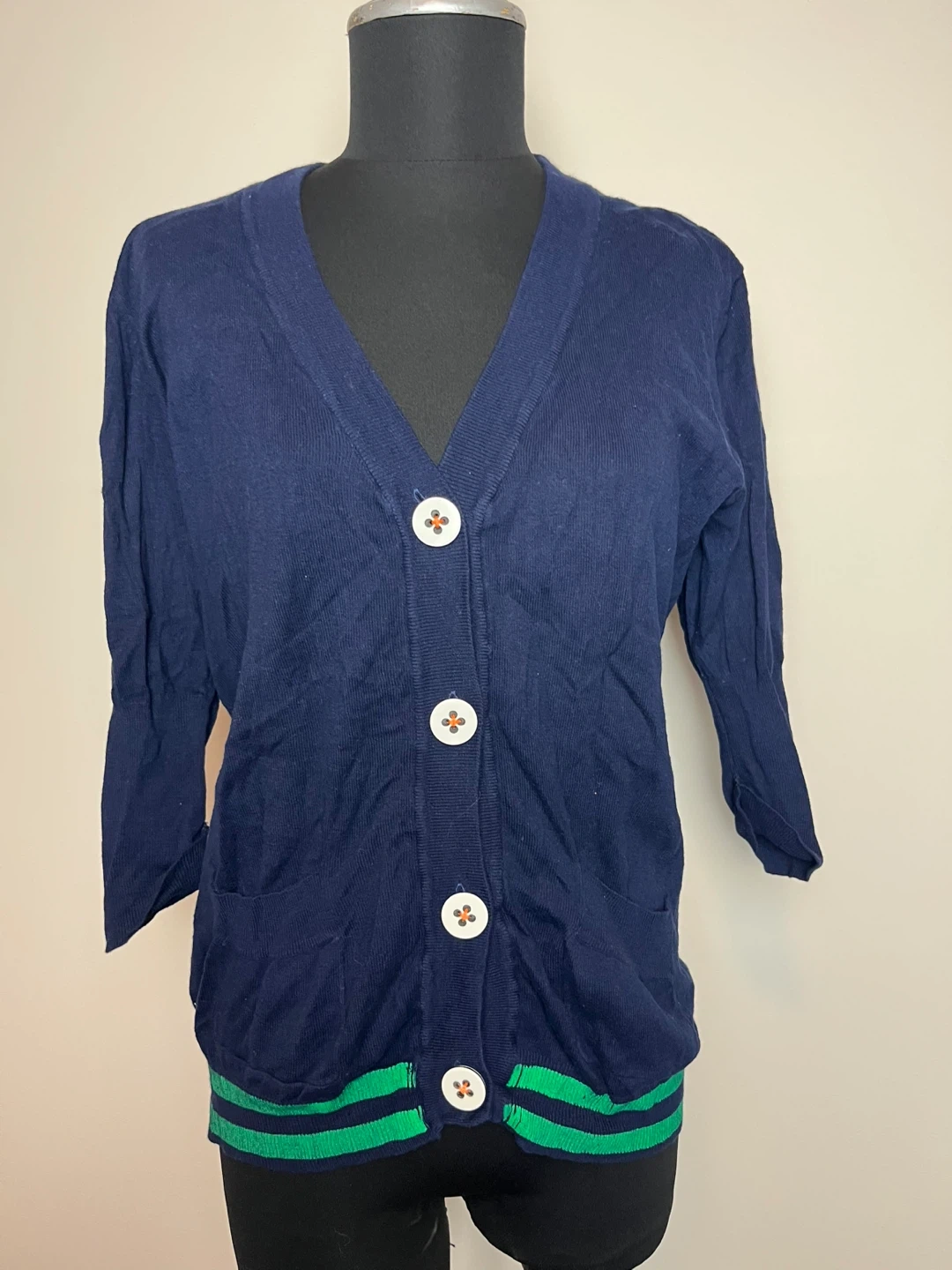 This navy blue cardigan features a colourful floral design on the back and a decorative orange graphic inside. It has white buttons and two front pockets. Size medium, made in China. Adds a touch of unique style to any outfit!