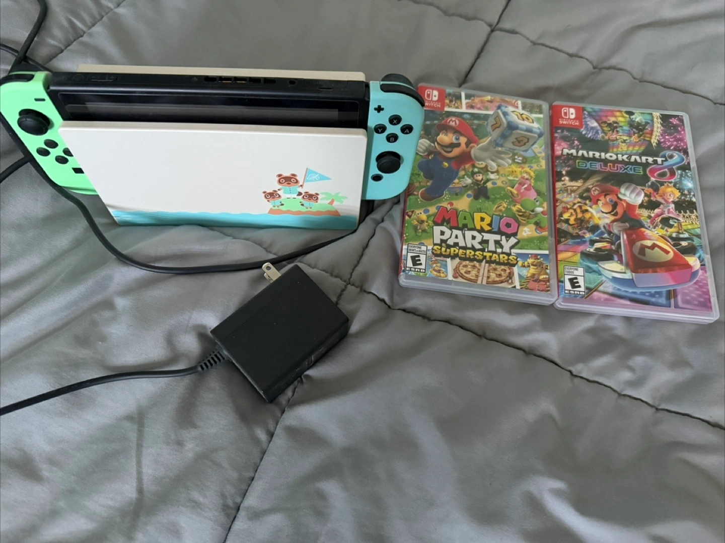 Nintendo Switch Animal Crossing Edition console. Includes light teal joy-con controllers, ACNH console design, power adapter, and two games: Mario Party Superstars and Mario Kart 8 Deluxe. No HDMI Cable included.