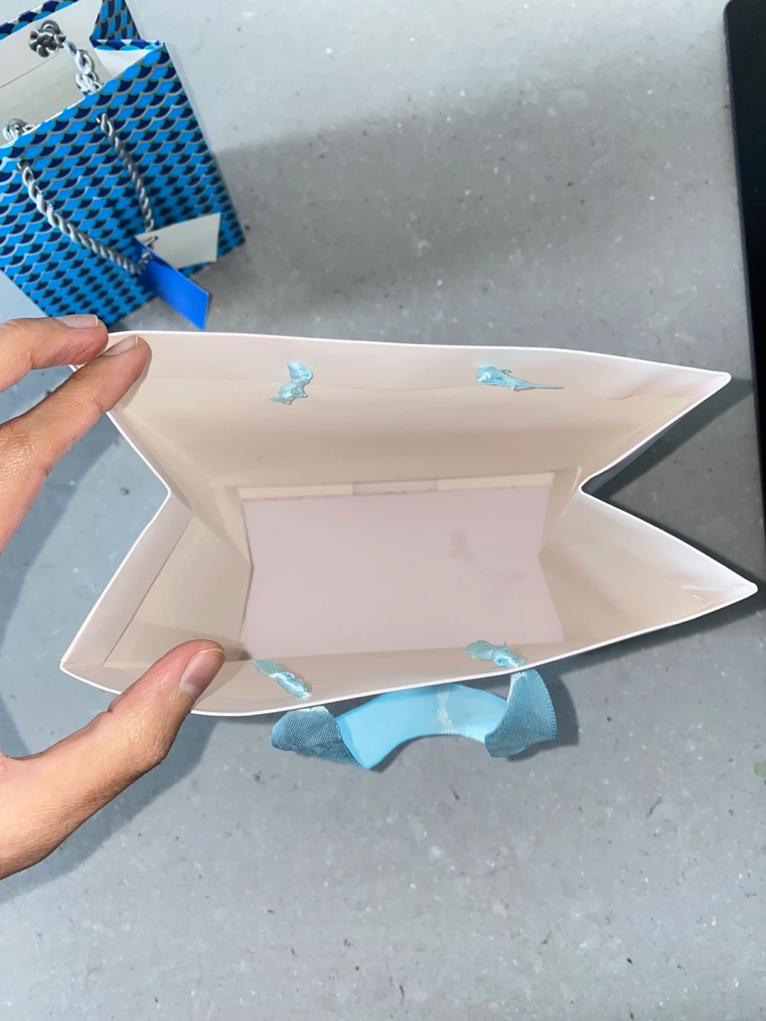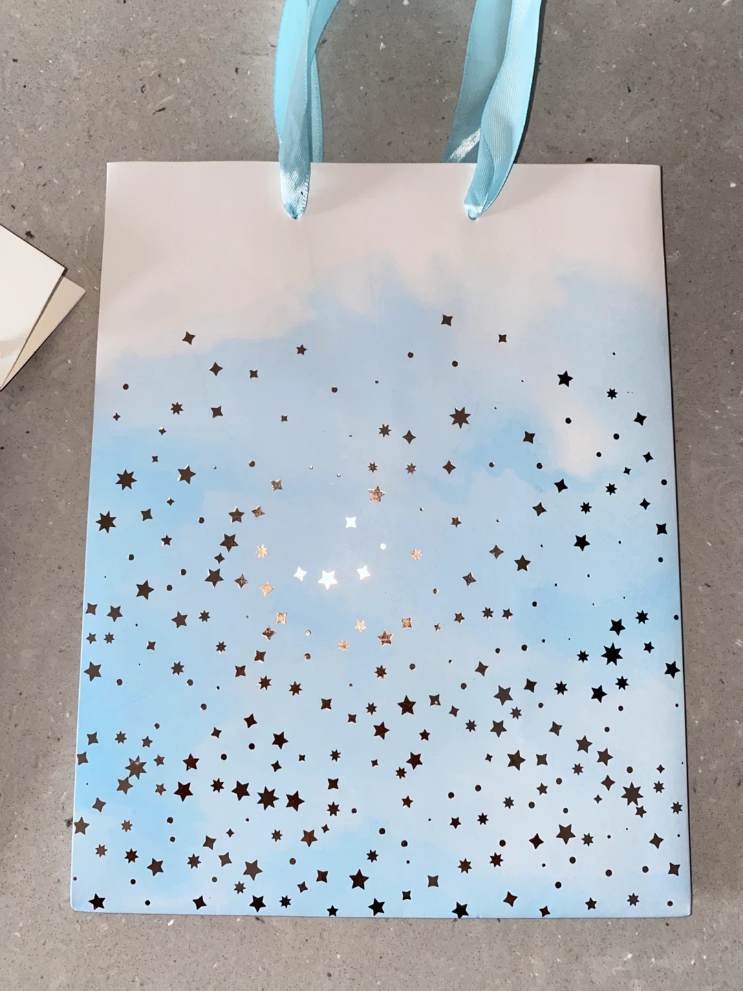 Selling a set of two gift bags in different shades of blue! One has a golden star pattern that reflects light and the other has a scale pattern. Perfect for any occasion!