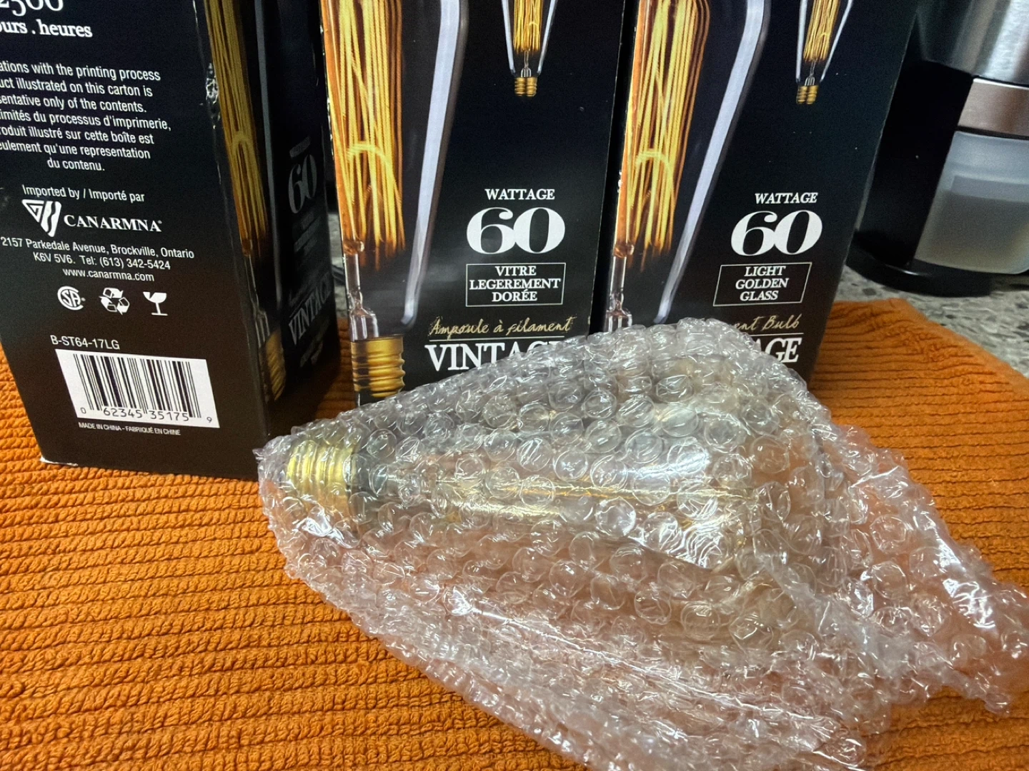 Three CANARNA vintage filament light bulbs. Each bulb is 60 watts with a light golden glass finish. They feature a medium base, ST type.