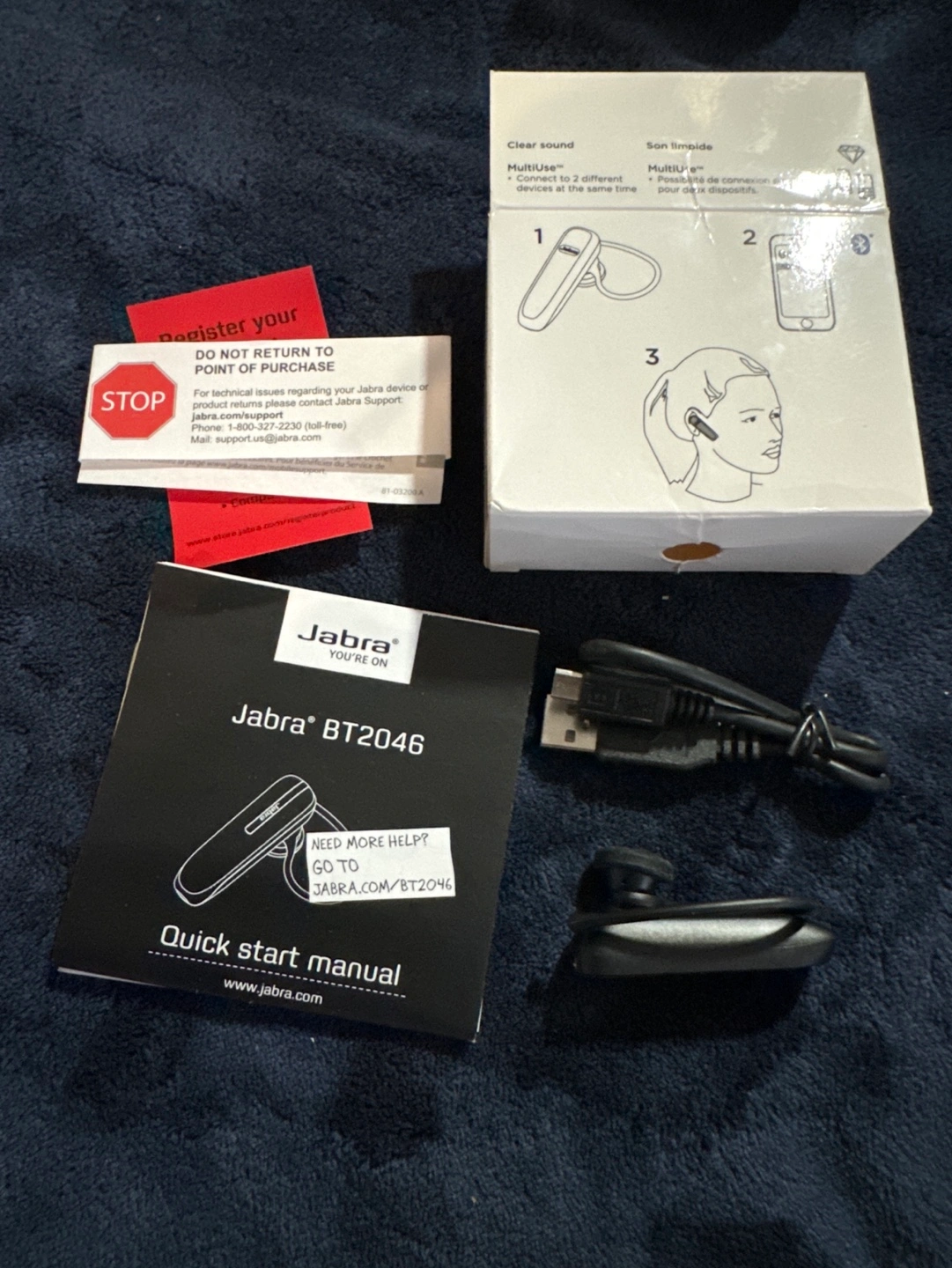 New Jabra BT2046 Bluetooth headset. Includes charging cable and manual. MultiUse™ technology connects to two devices simultaneously. Clear sound. Compact and comfortable design.