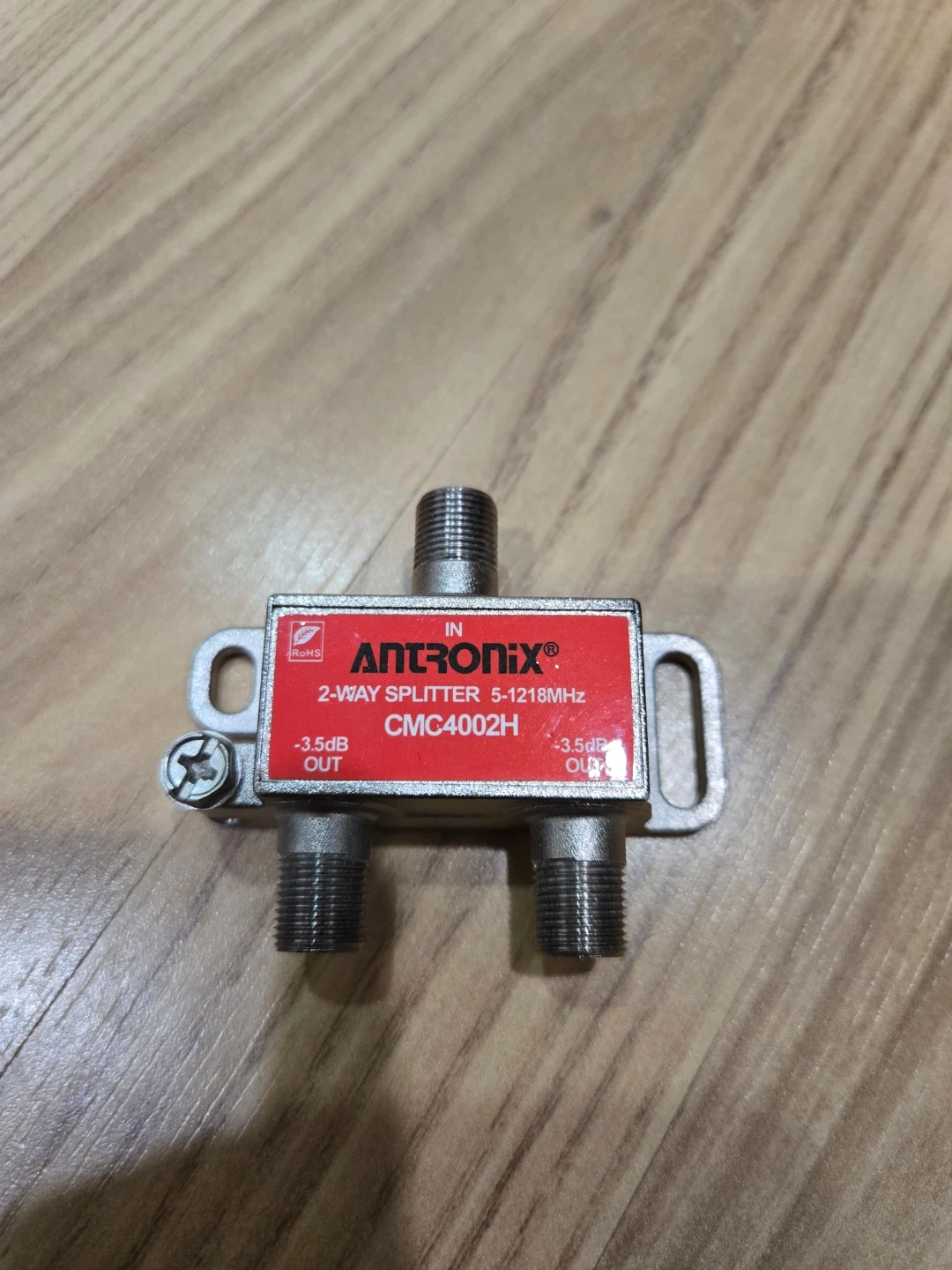 This is an Antronix 2-way splitter. It's a CMC4002H model with a frequency range of 5-1218MHz. Each output has a -3.5dB split.