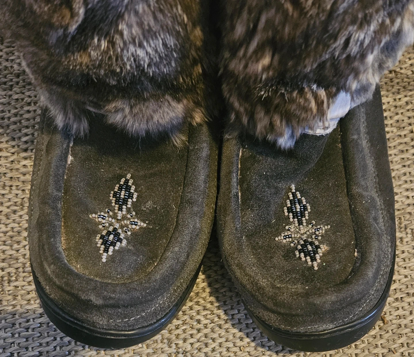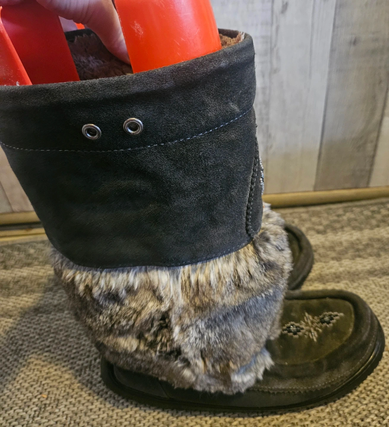 Stylish Manitobah Mukluks Women's Waterproof Snowy Owl mukluk boots in grey suede with rabbit fur trim. Perfect for winter fashion.