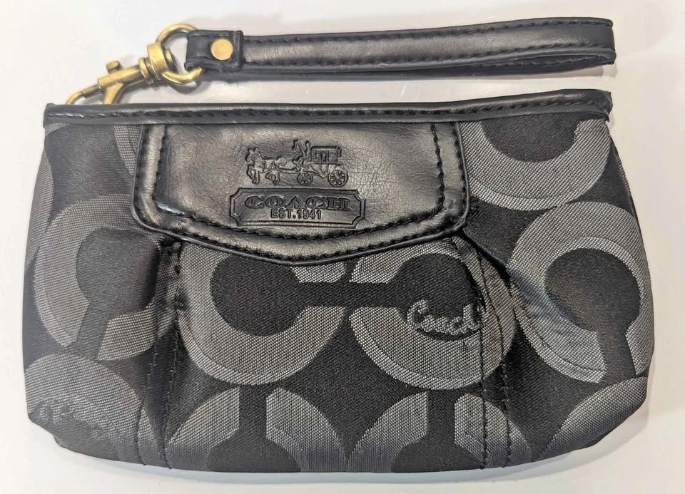 Add a touch of archival luxury to your collection with this authentic Coach wristlet. This piece features the iconic oversized Signature "C" jacquard and the timeless brass Horse & Carriage leather logo plate—a true hallmark of late 2000s designer style.