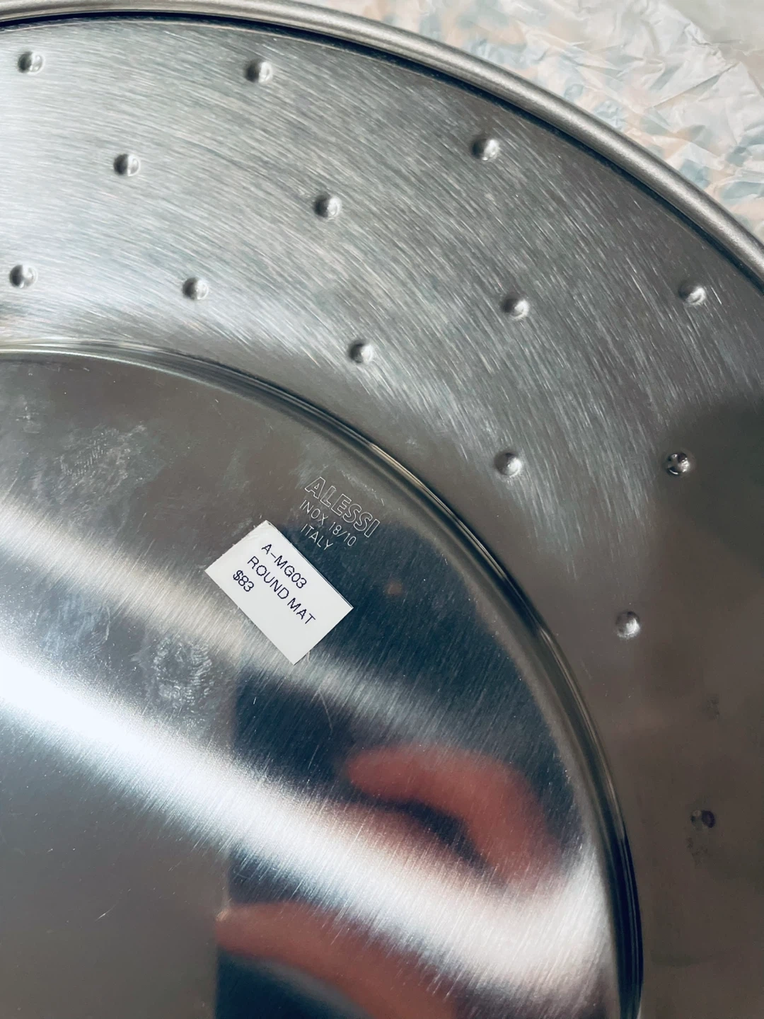 This is a collectable Alessi MG03 round tray. It's made of 18/10 stainless steel. Designed by Michael Graves. It's 31.5 cm in diameter.