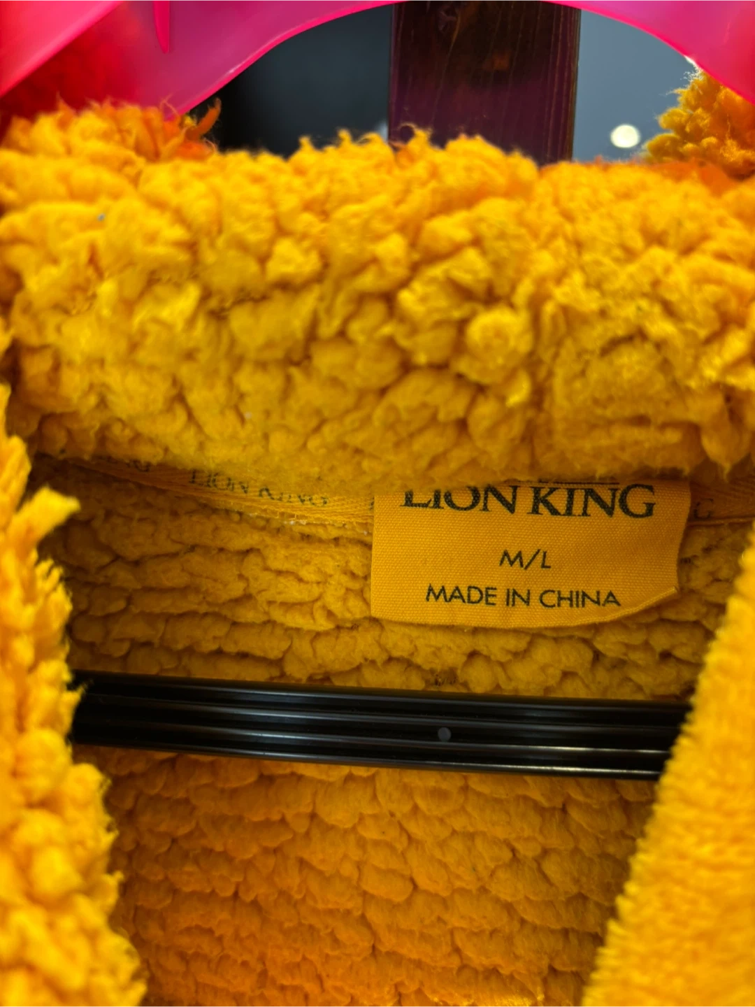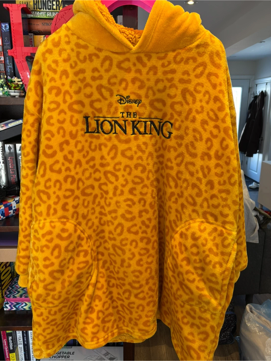 Stay cozy in this "The Lion King" sherpa hoodie blanket. It's super soft and features a fun leopard print design. Made in China, size M/L.