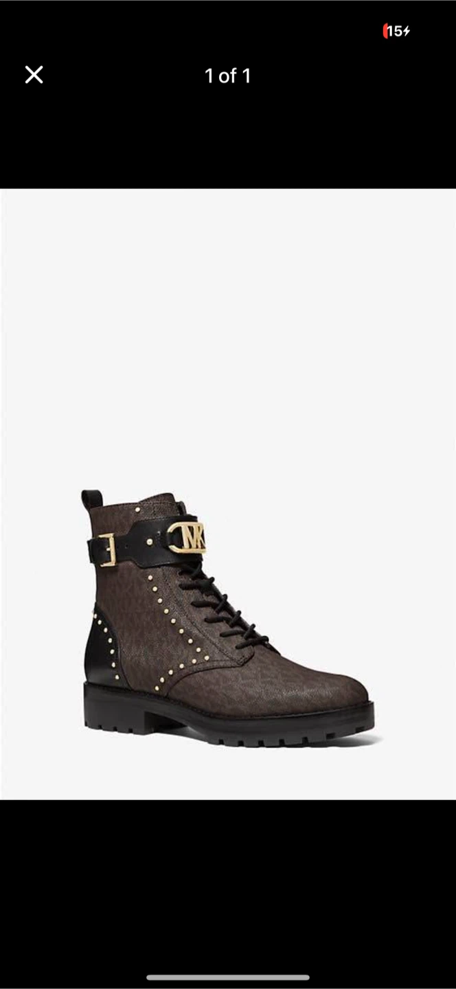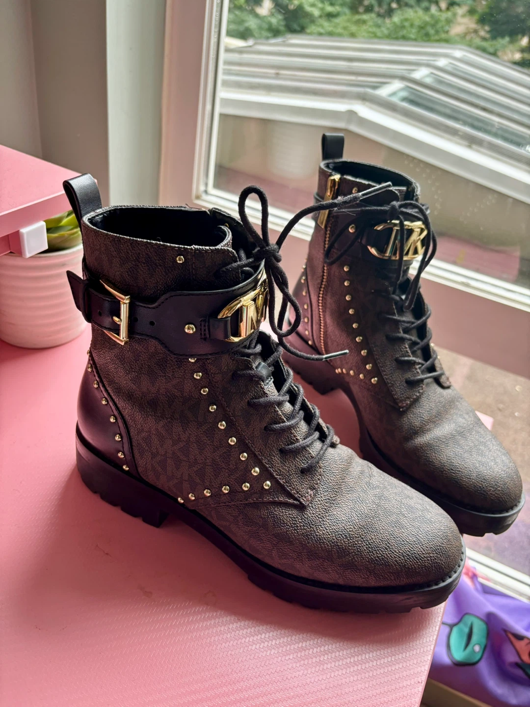 Stylish Michael Kors combat boots in a lovely brown colour. These boots feature the MK logo pattern and gold stud detailing. Perfect for adding a bit of edge to any outfit!