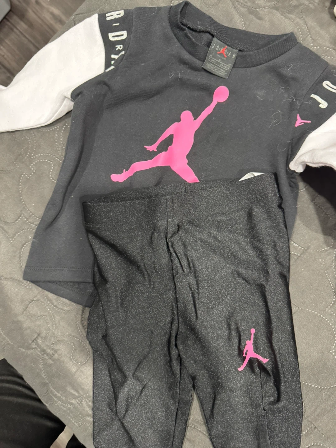 This is a toddler Jordan long sleeve shirt with matching pants. The set is black and white with bright pink Jumpman logos. It's made of a soft fabric, perfect for everyday wear. The shirt has 'JORDAN' printed on the sleeves.
