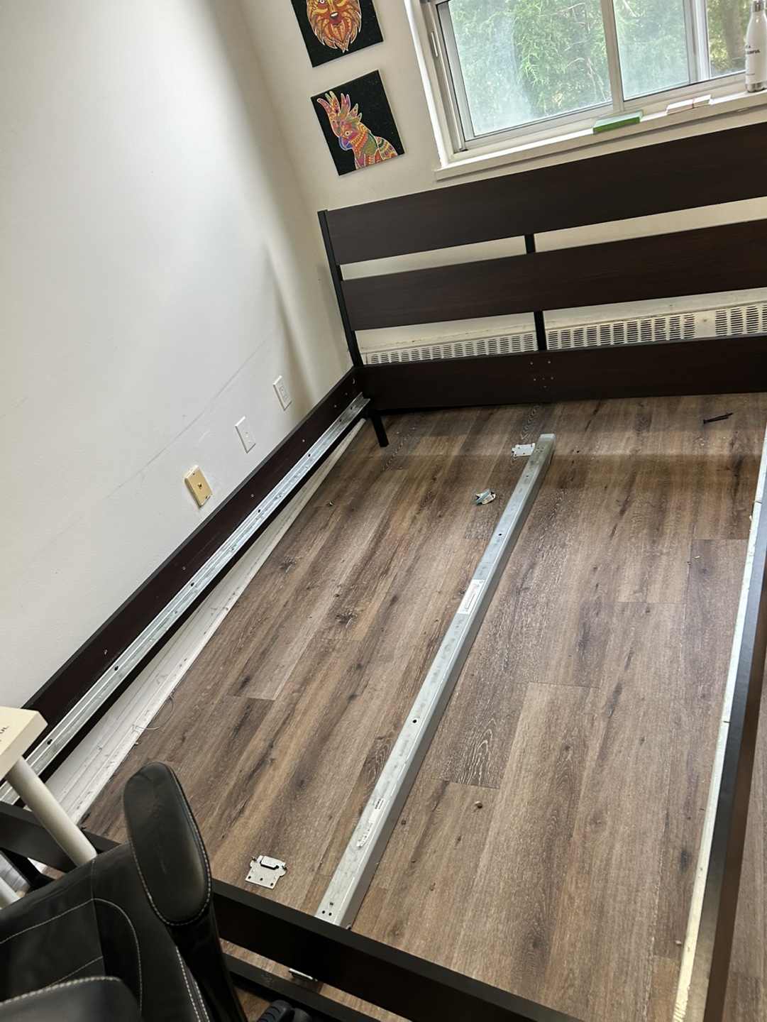 Queen-sized bed frame with headboard and footboard. Includes slats to support mattress. Retail price :499$ +60$ slats +taxes