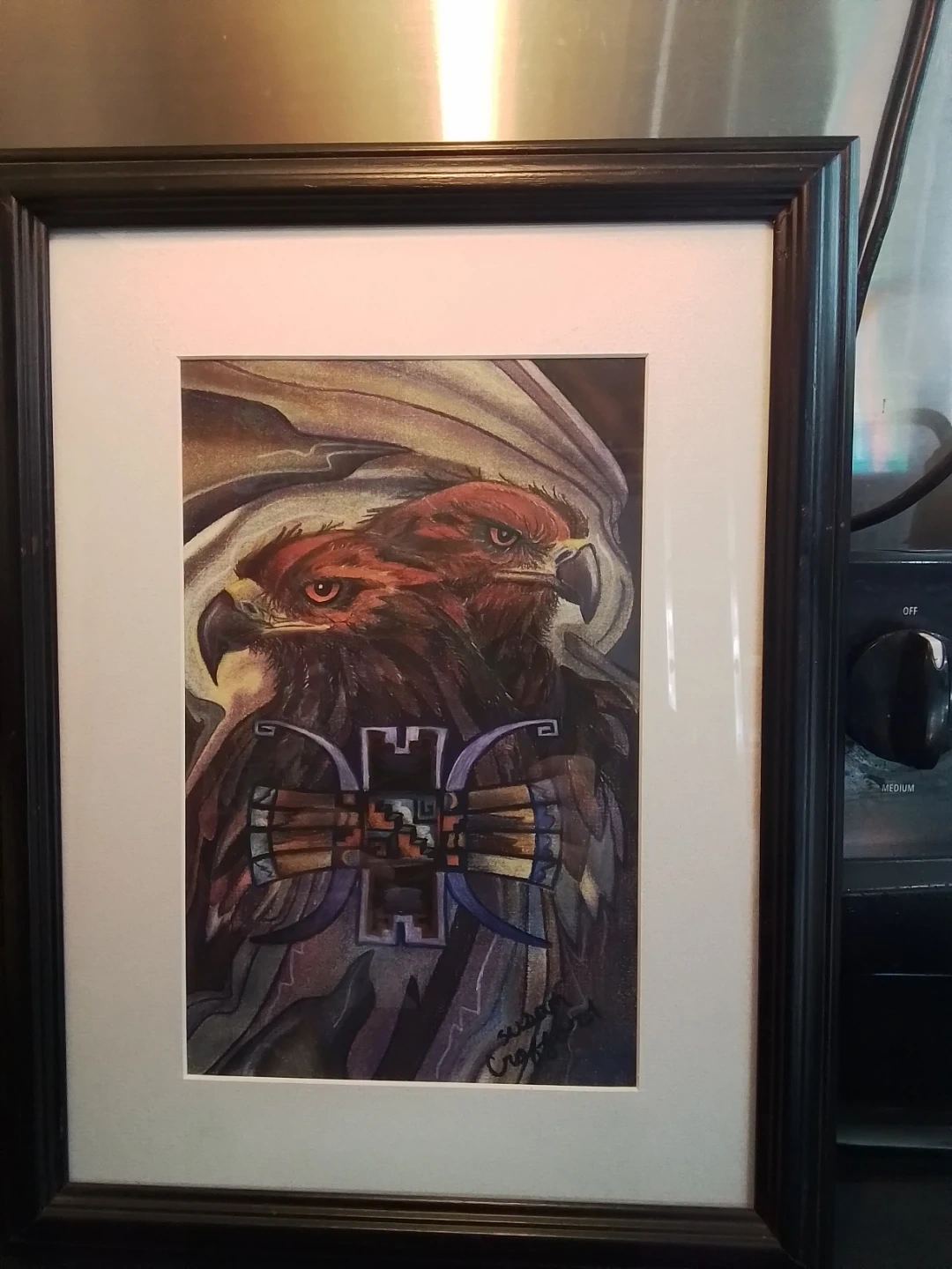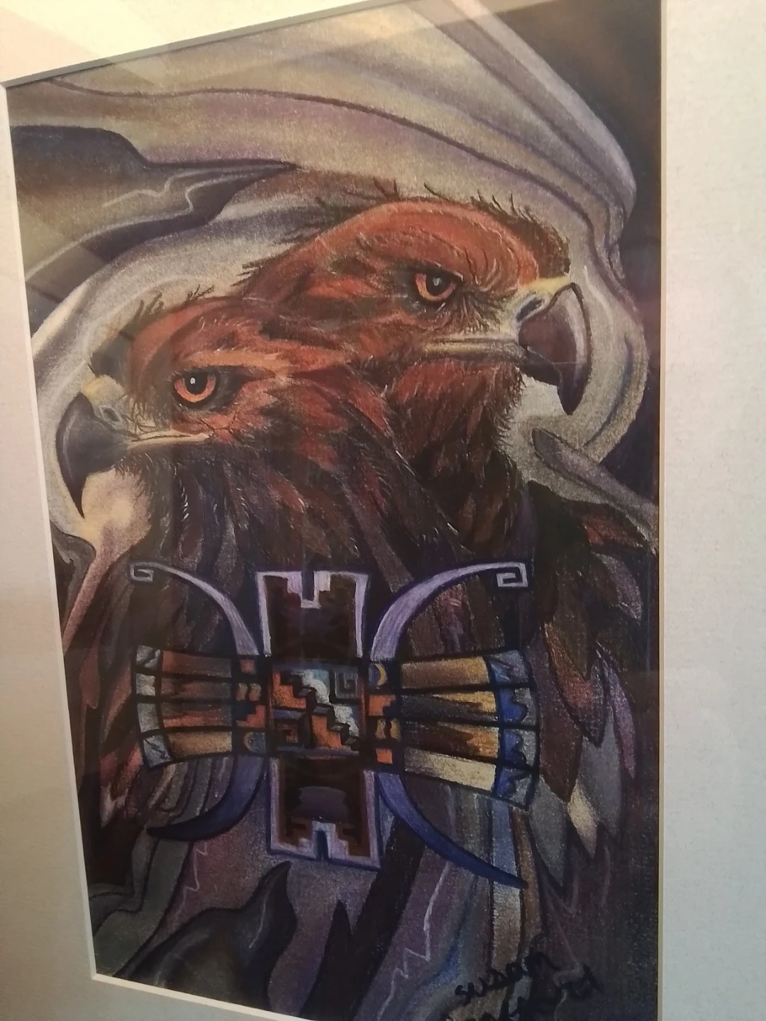 This "Sky Gods" silkscreen by artist Susan Crofford, measuring 13x17 inches, captures a striking image of eagles and native art. In good condition, this framed piece adds a unique touch to any collection or decor.