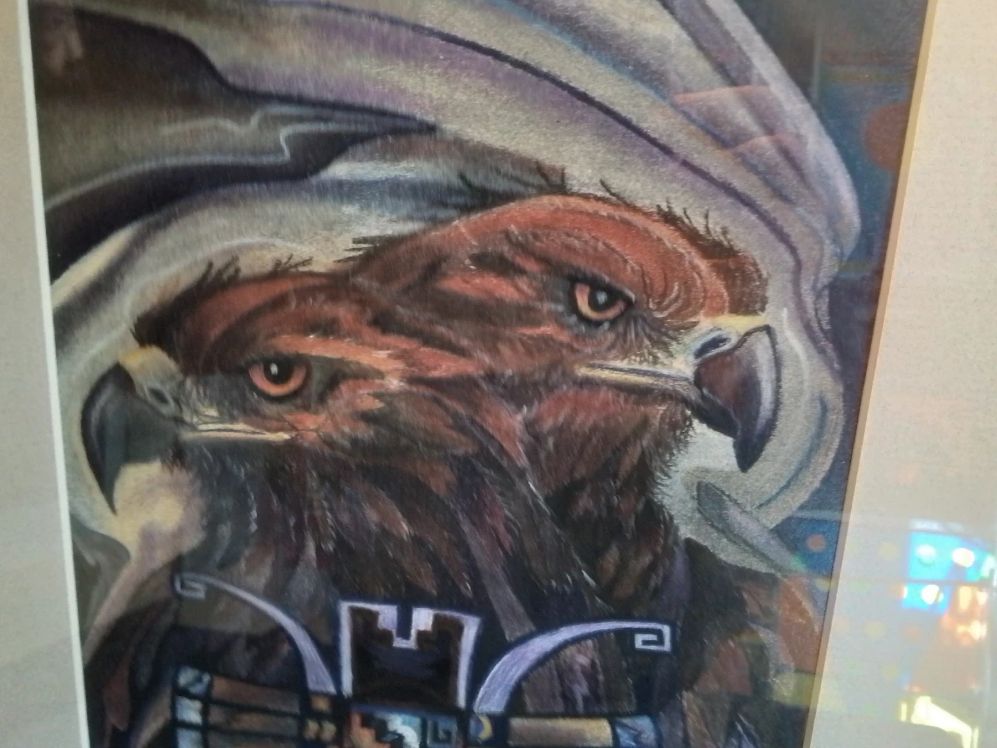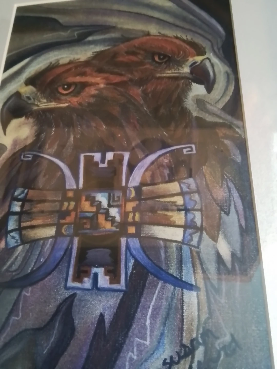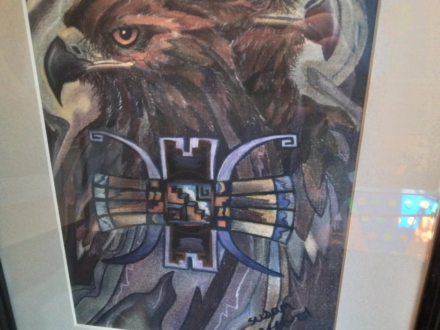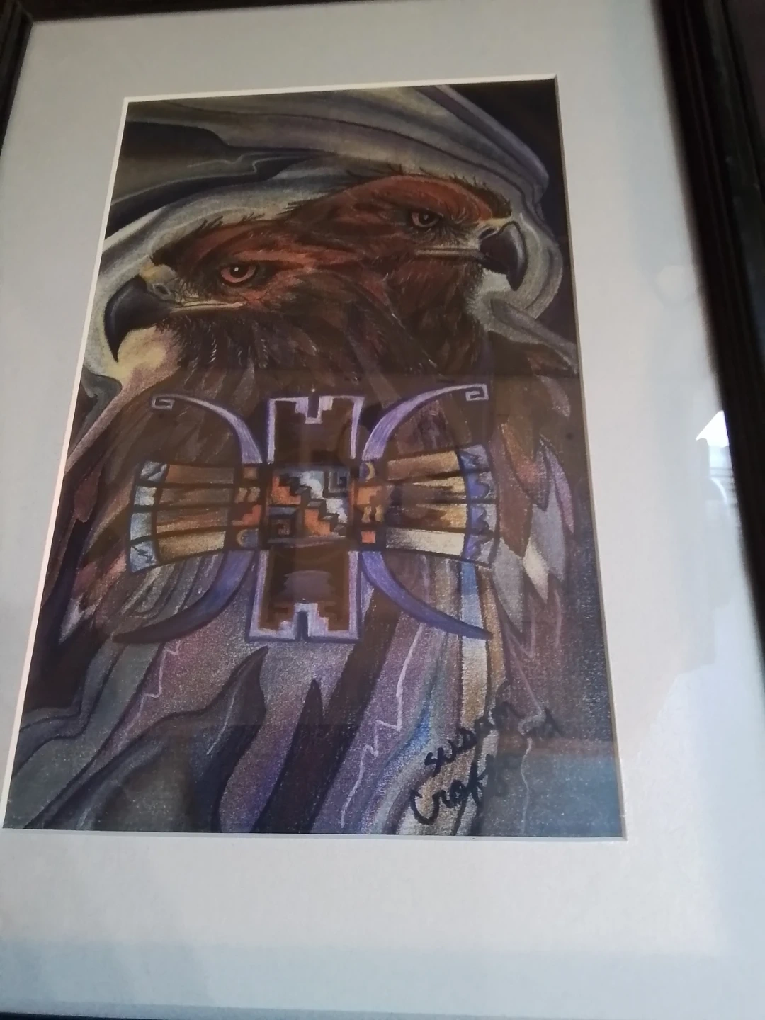 This "Sky Gods" silkscreen by artist Susan Crofford, measuring 13x17 inches, captures a striking image of eagles and native art. In good condition, this framed piece adds a unique touch to any collection or decor.