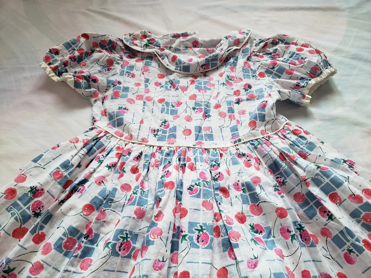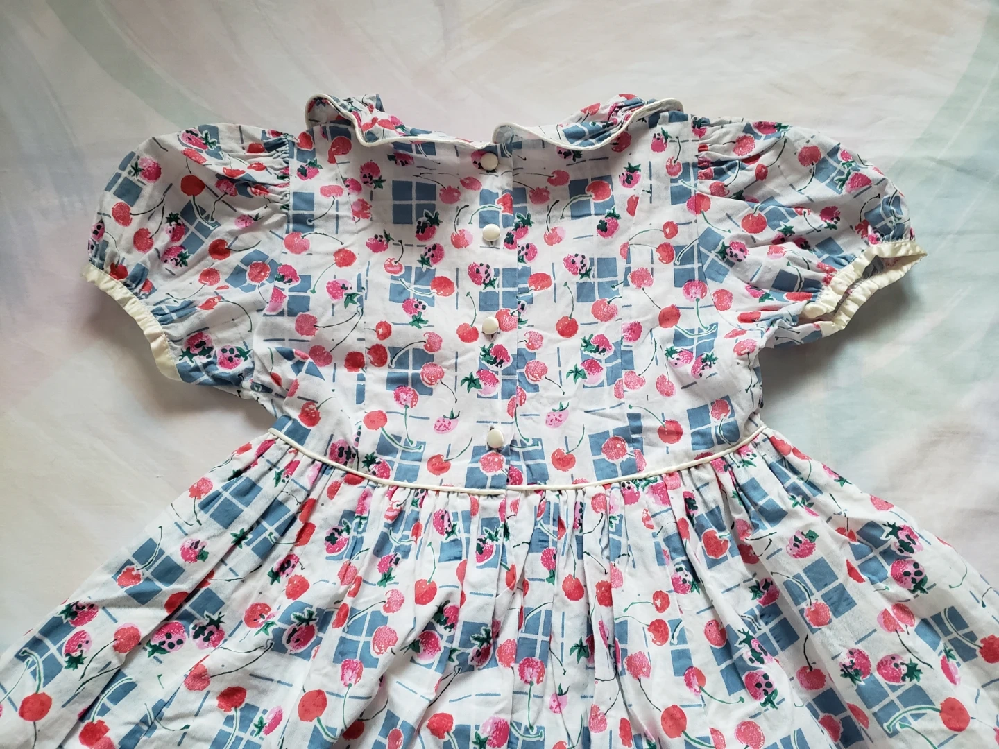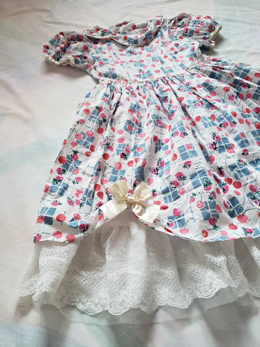 Giving away a kids dress that features a playful cherry print, short puff sleeves, layered skirt with lace trim and button closure at the back