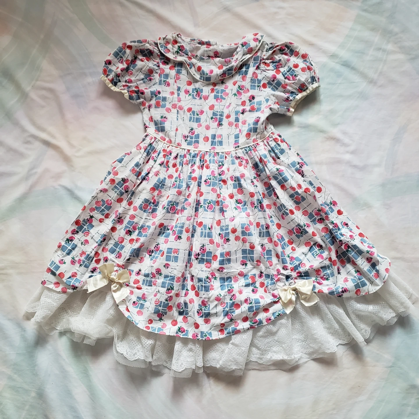 Giving away a kids dress that features a playful cherry print, short puff sleeves, layered skirt with lace trim and button closure at the back