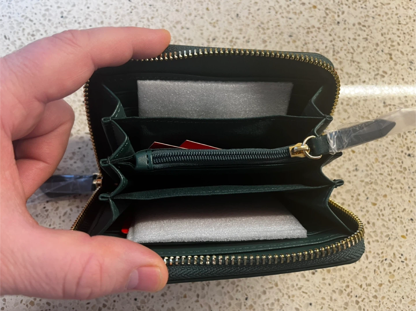 This is a Valentino women's wallet in a deep forest green colour. It's made from textured leather and features a zip-around closure with multiple interior compartments. The wallet comes with its original red box, making it a great option for gifting or for personal use.