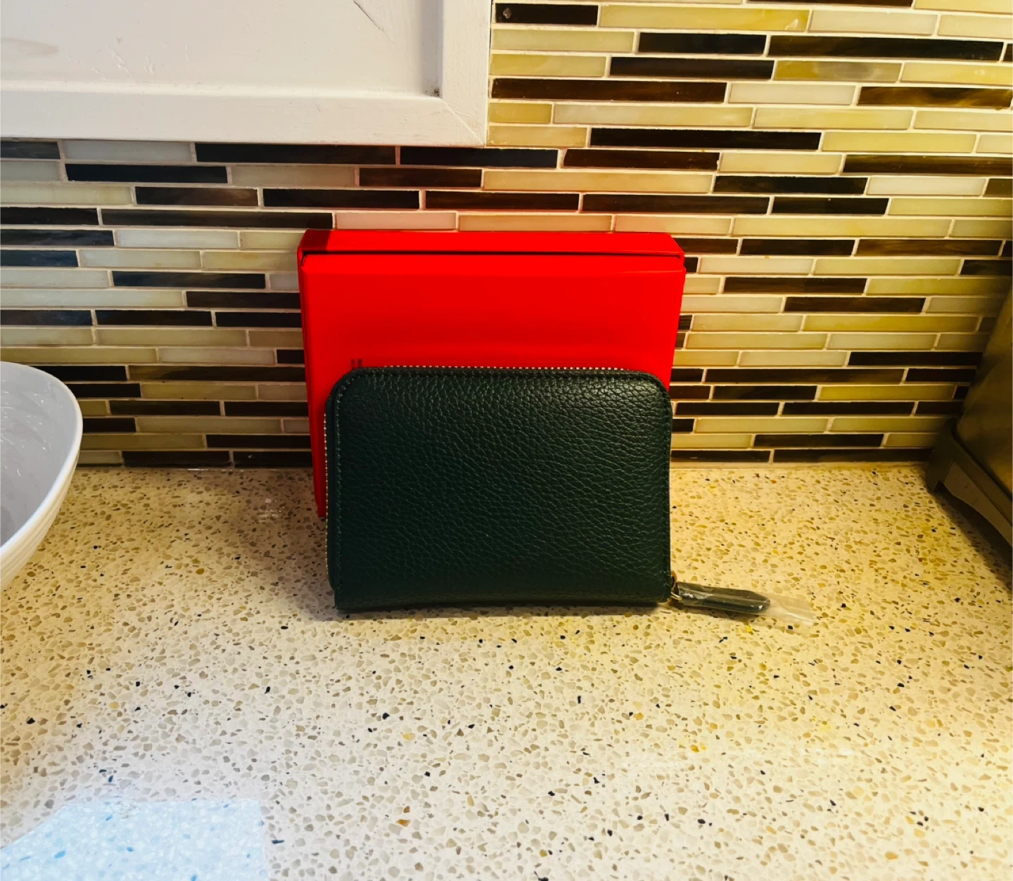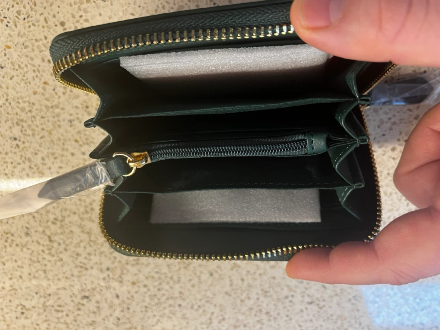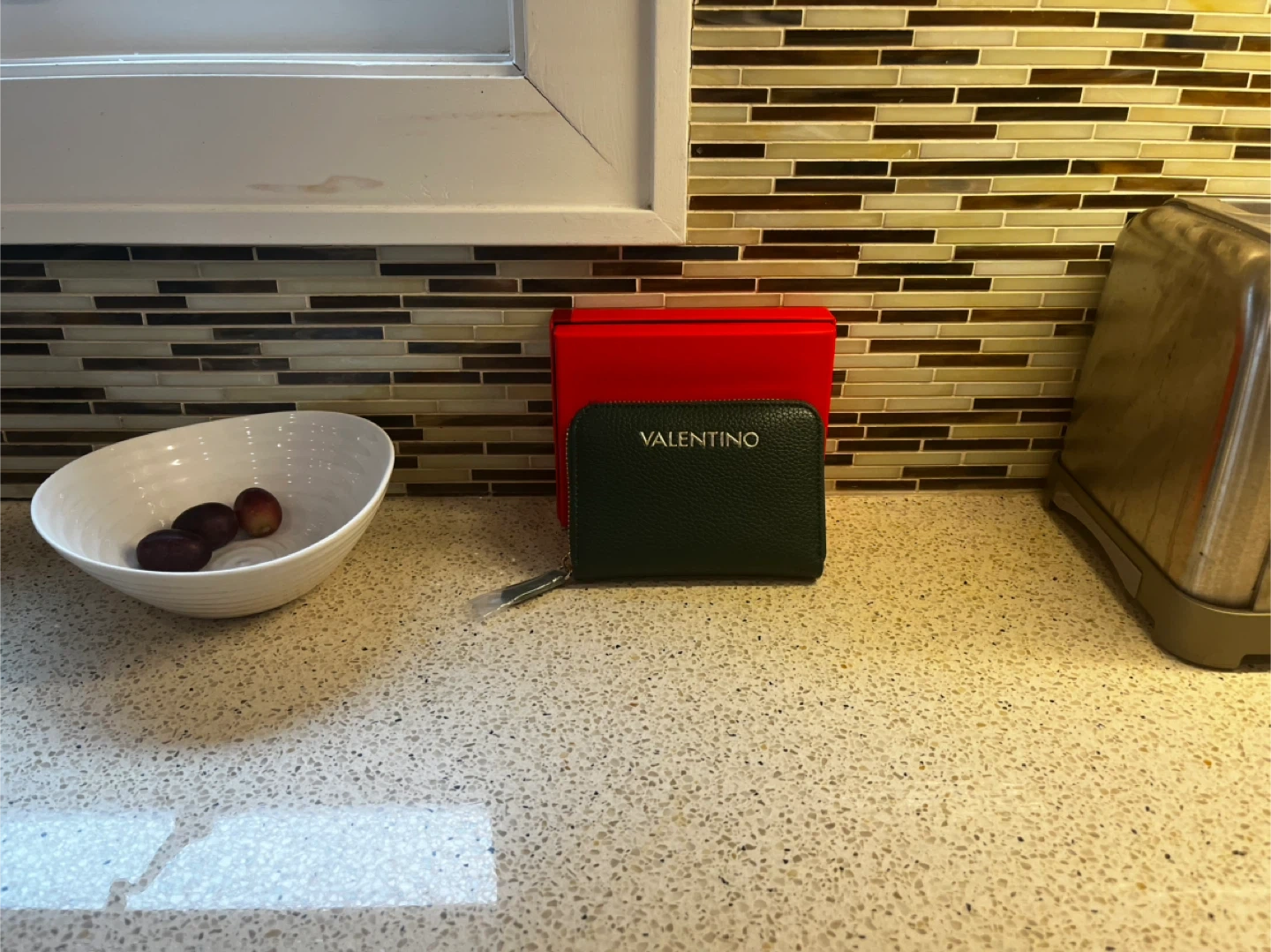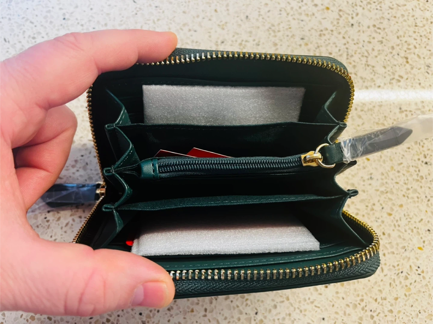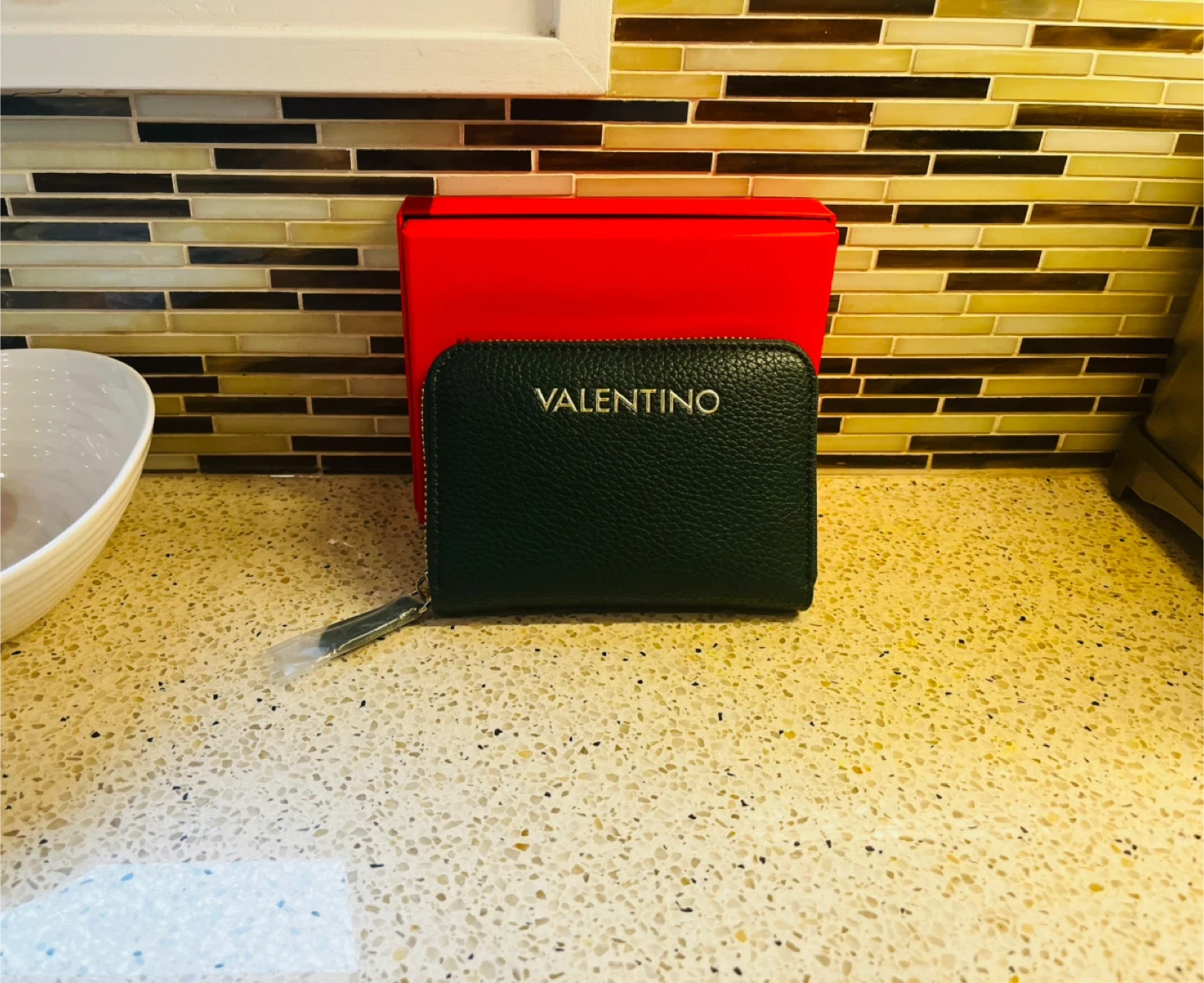 This is a Valentino women's wallet in a deep forest green colour. It's made from textured leather and features a zip-around closure with multiple interior compartments. The wallet comes with its original red box, making it a great option for gifting or for personal use.