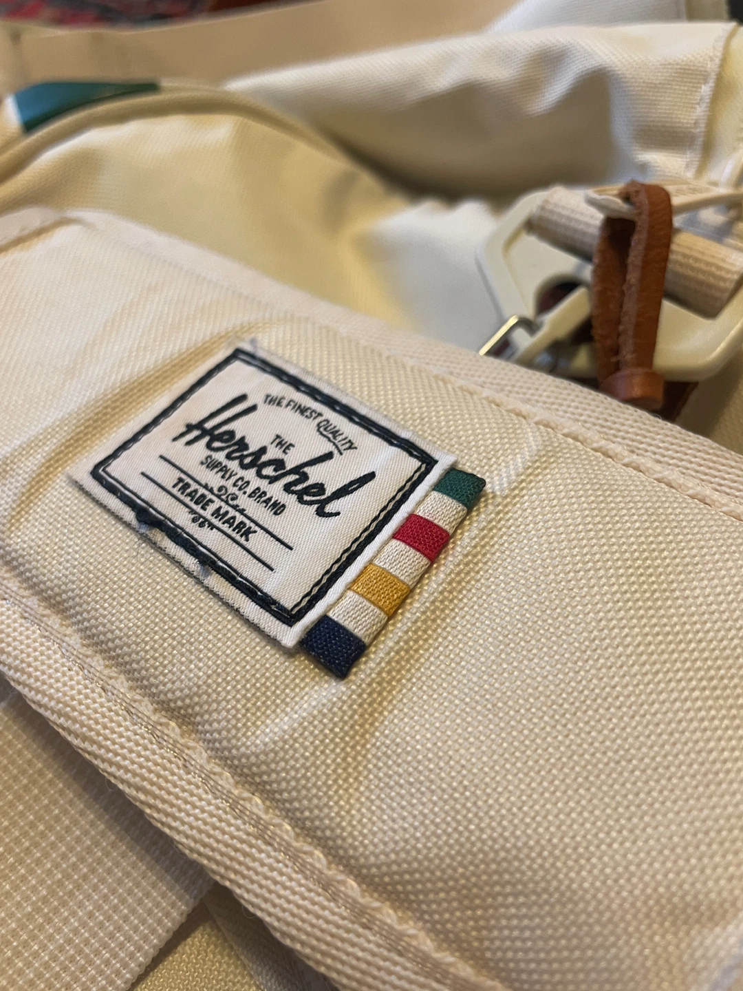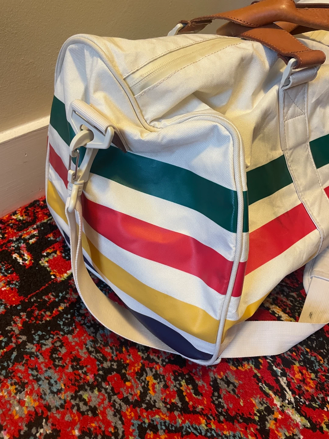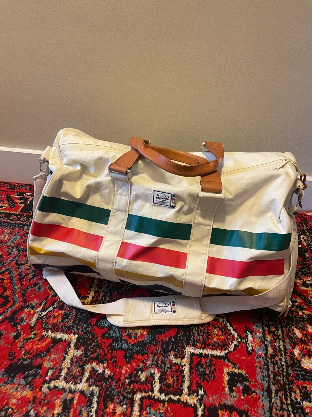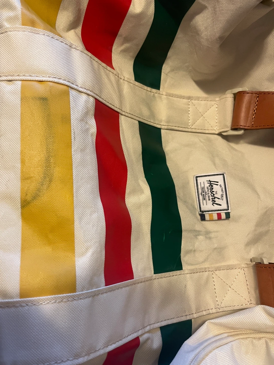 Selling this used HBC x Herschel Duffel Bag (retailed in 2016) that “combines the iconic HBC stripes with premium Herschel Supply finishes, including vegetable tanned leather and blue chambray liners.” See photos for general condition - aside from a few scruffs to outer fabric that could be cleaned up, the duffel is in great condition with no tears, rips, or stains. Internal lining is in perfect condition and all zippers are intact. Let me know if you have any questions about the item.