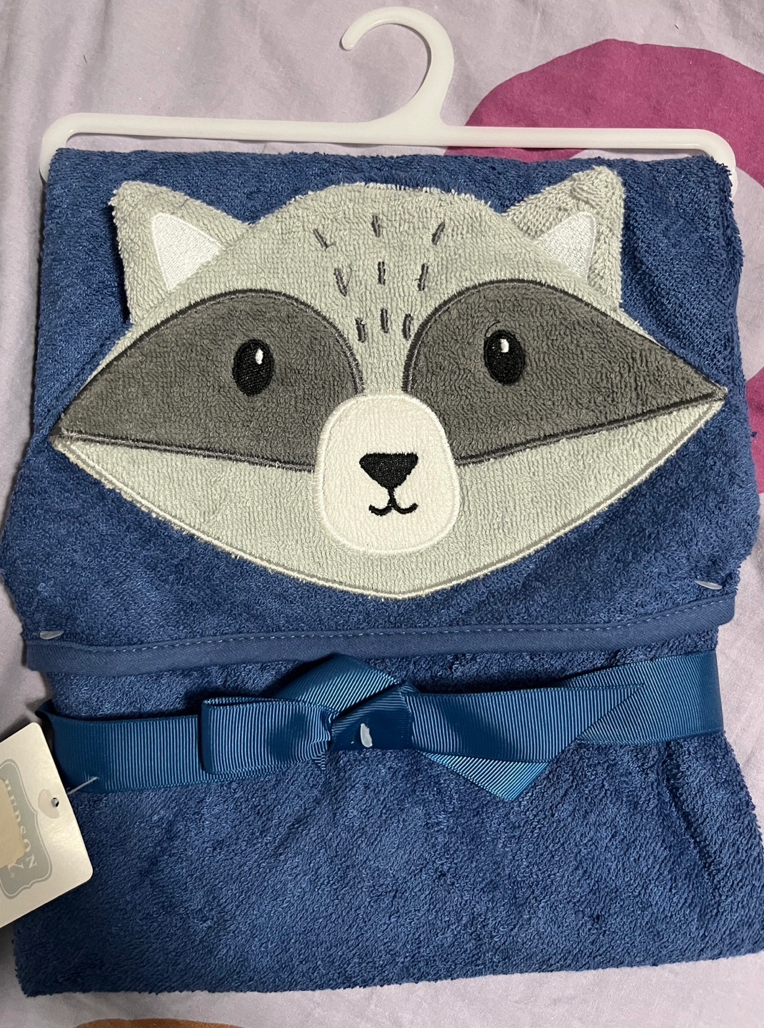 Adorable hooded towel, features a raccoon face. Soft material, perfect for bath time. Navy blue colour. Comes with a ribbon. Brand new never used.