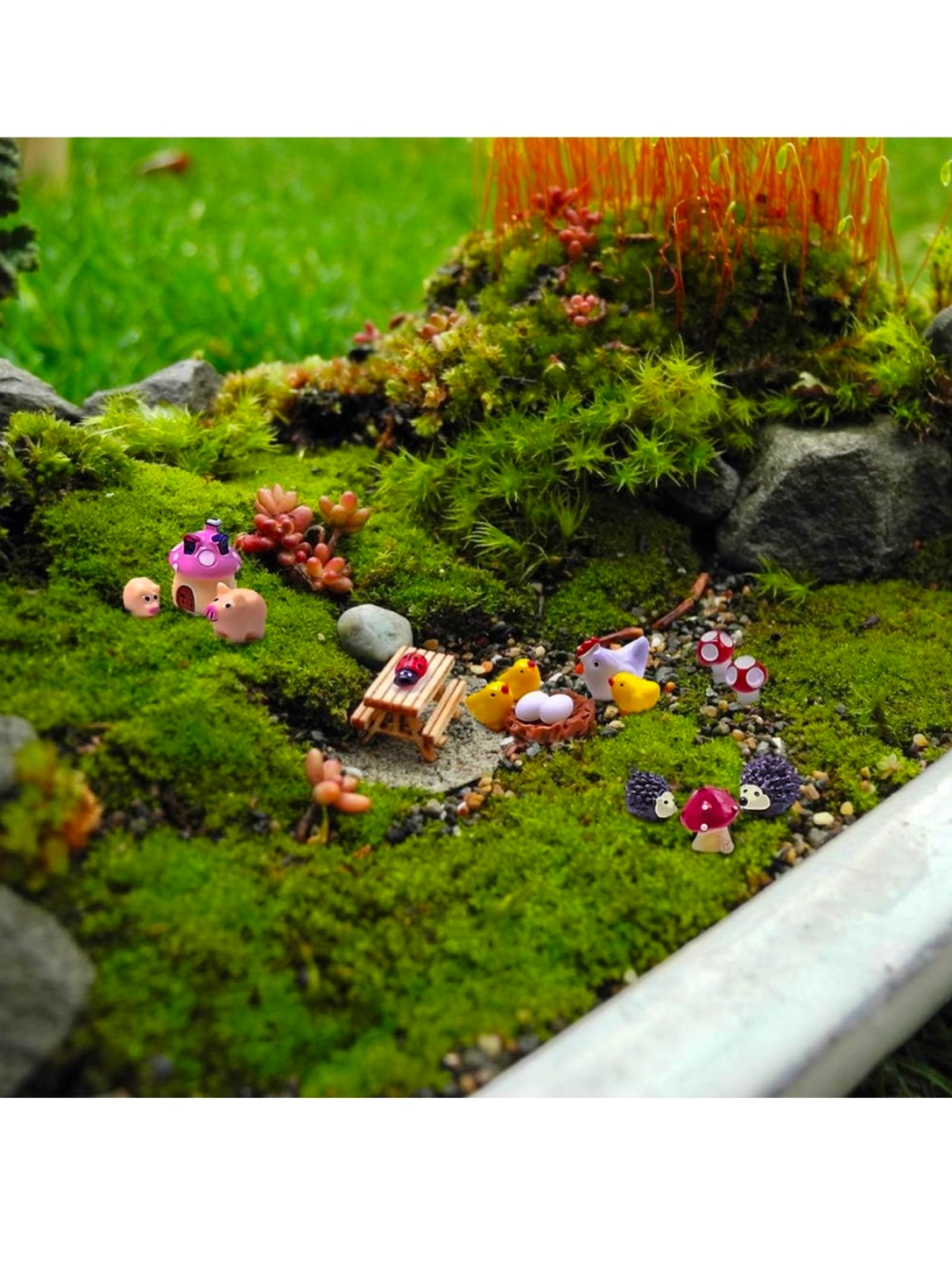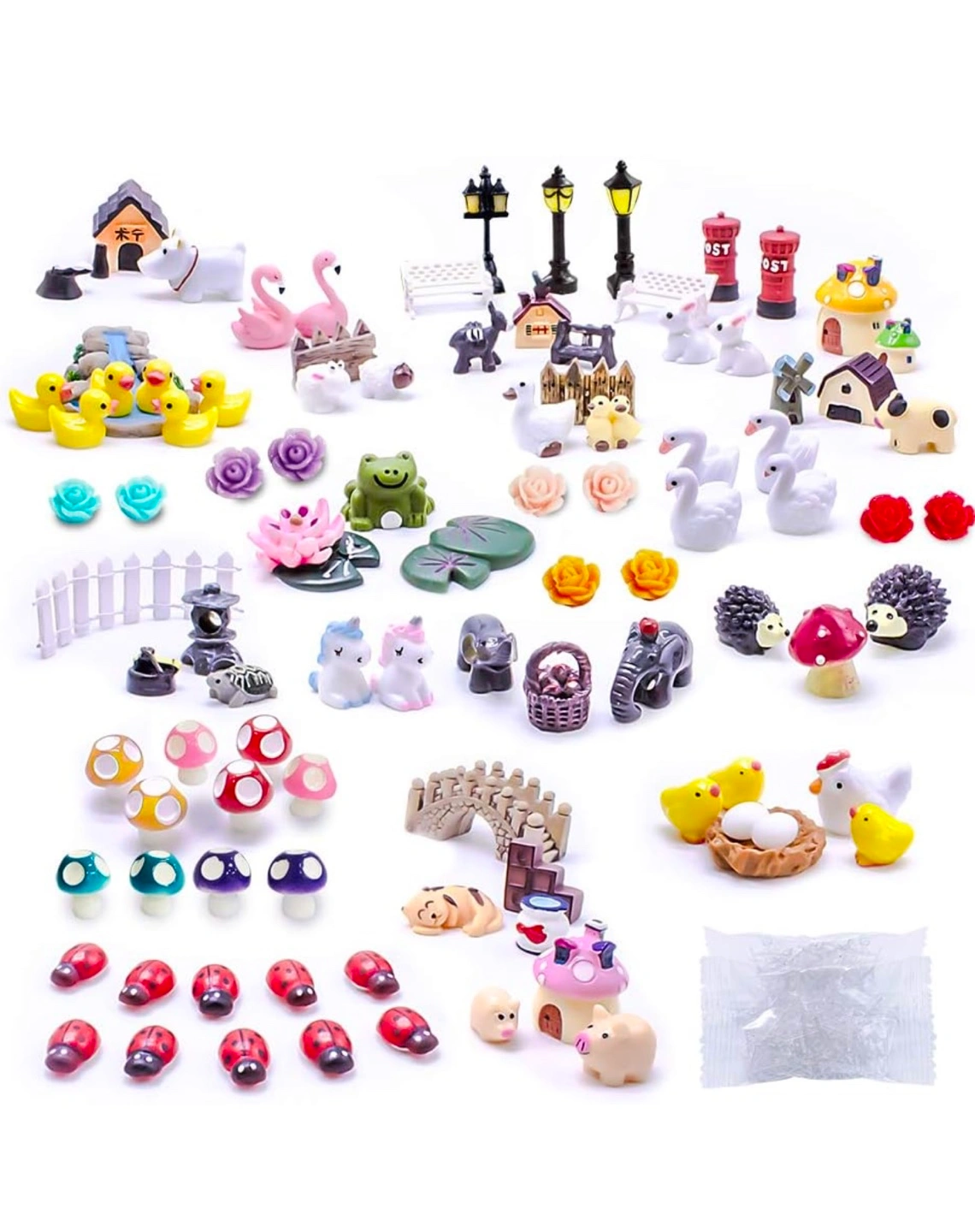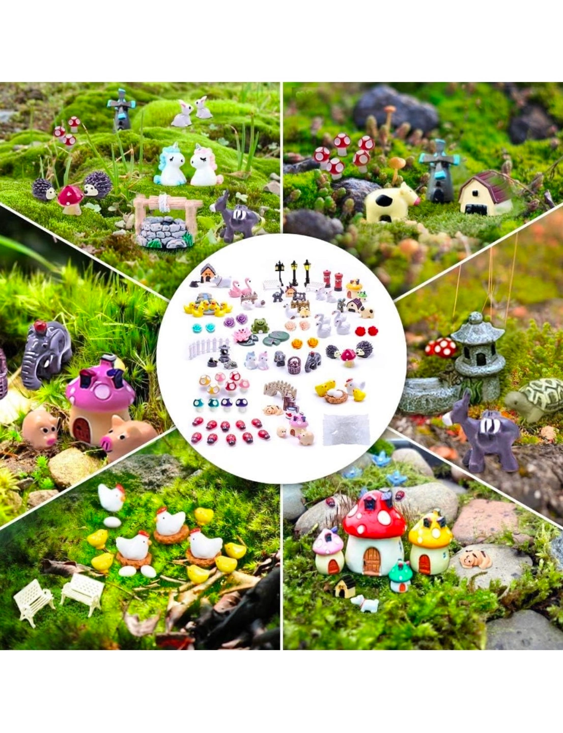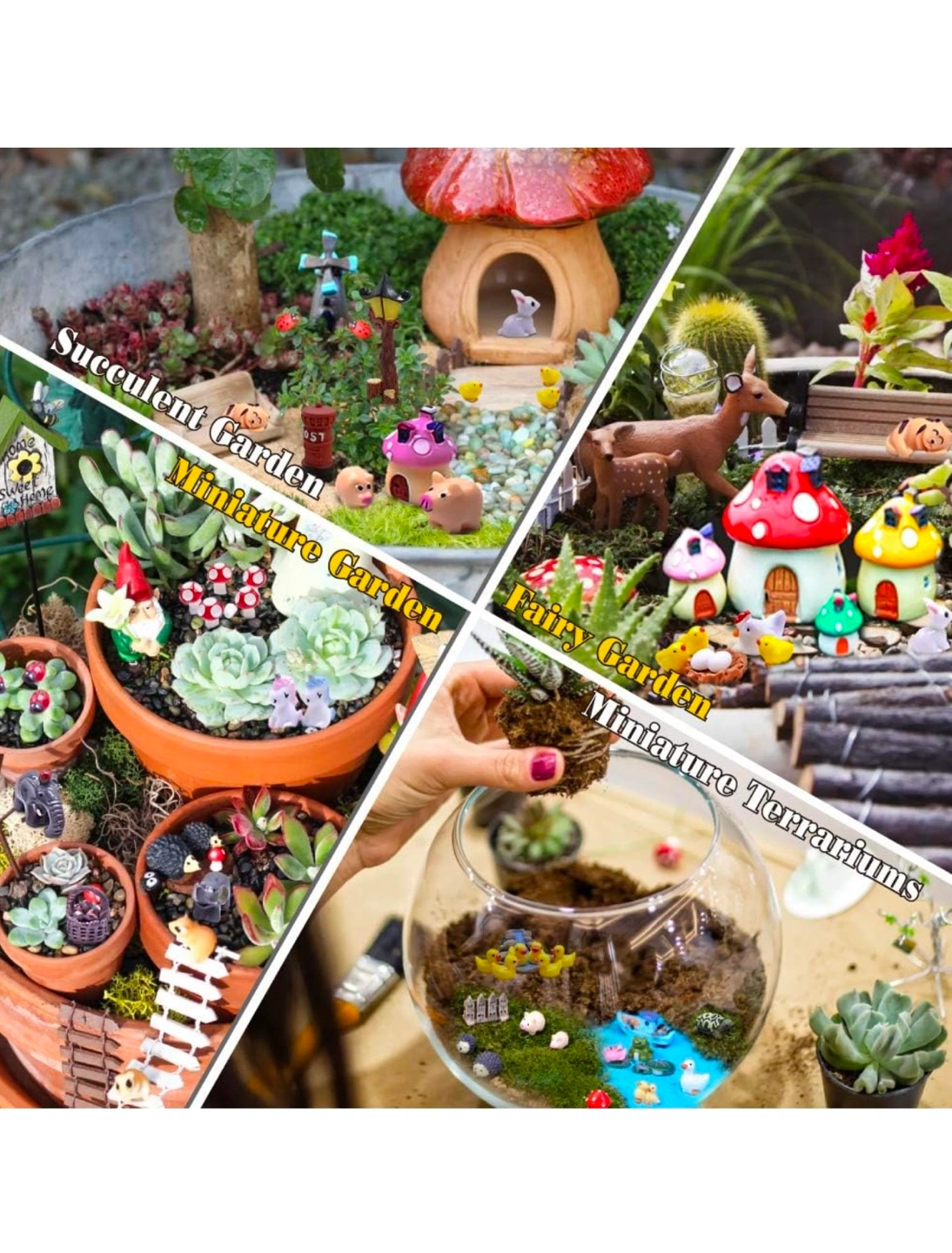 Large collection of miniature figurines. Perfect for terrariums, fairy gardens, or succulent gardens. Includes animals, houses, mushrooms, and more. Many colourful pieces.