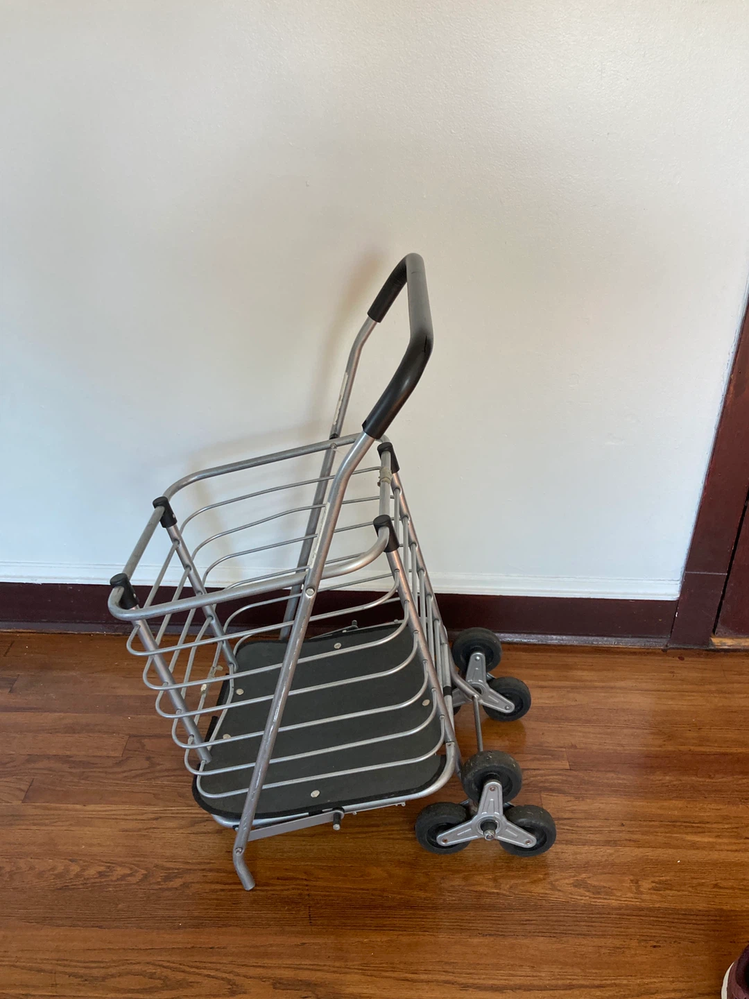 This is a handy folding shopping cart. It's made of metal with a black base and a padded handle. Features a unique stair-climbing wheel design. missing front wheels
