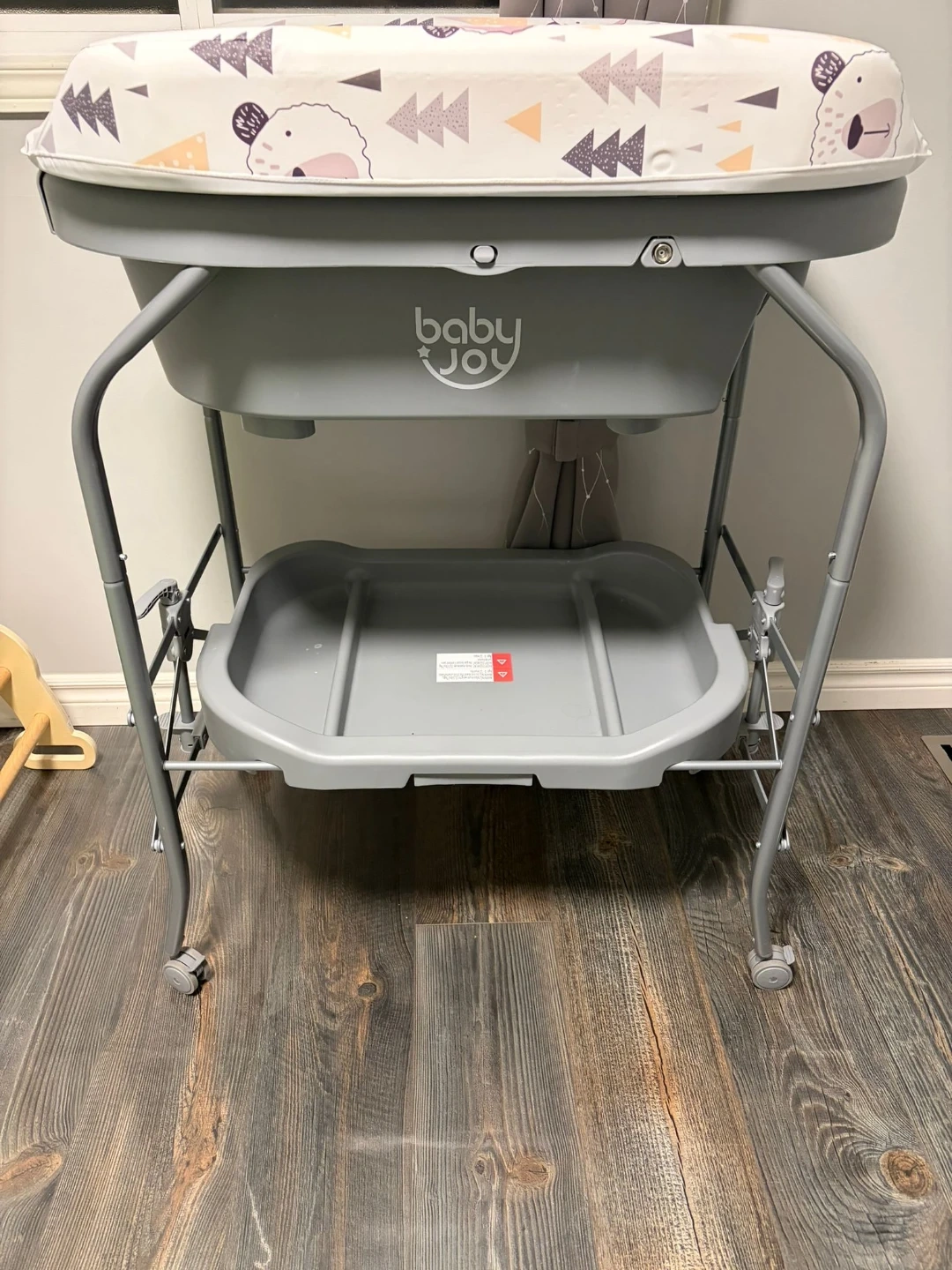 This Baby Joy bath station comes with a changing pad featuring a cute bear and mountain design. It includes a bath tub with a drain hose. This is great for keeping baby clean and comfortable during bath time!