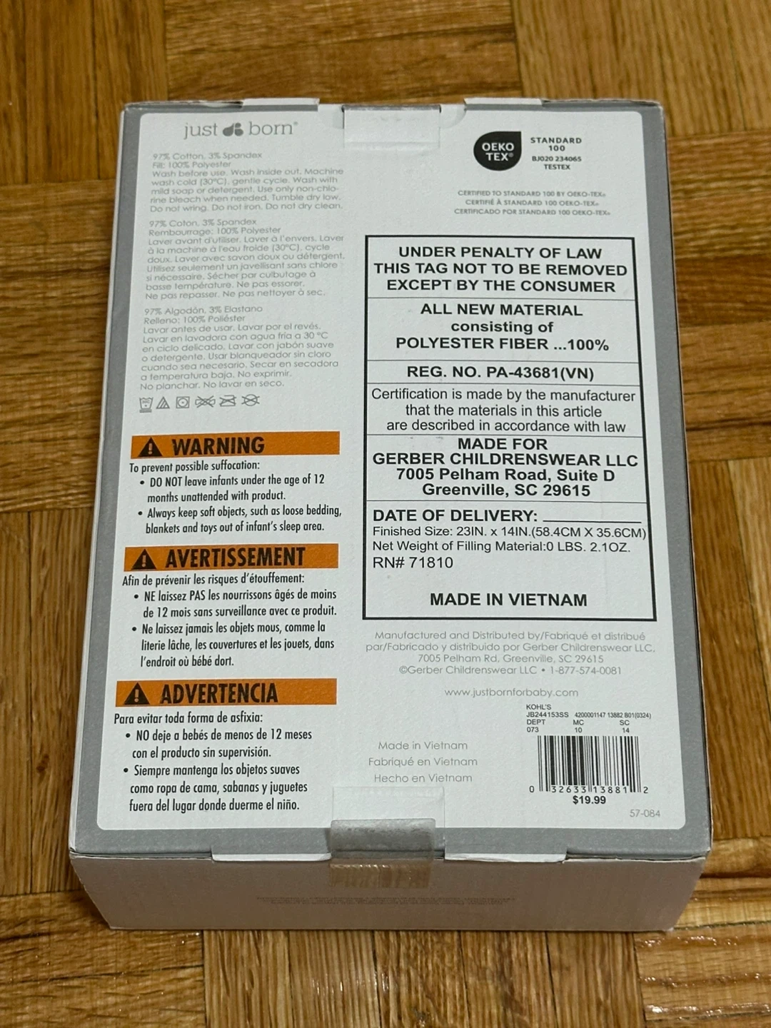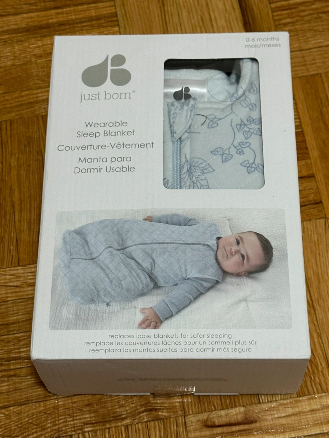 This wearable sleep blanket by Just Born is perfect for babies aged 0-6 months! It's made of 97% cotton and 3% spandex, making it soft and comfortable for your little one. It replaces loose blankets for safer sleeping. The finished size is 23in x 14in (58.4cm x 35.6cm).