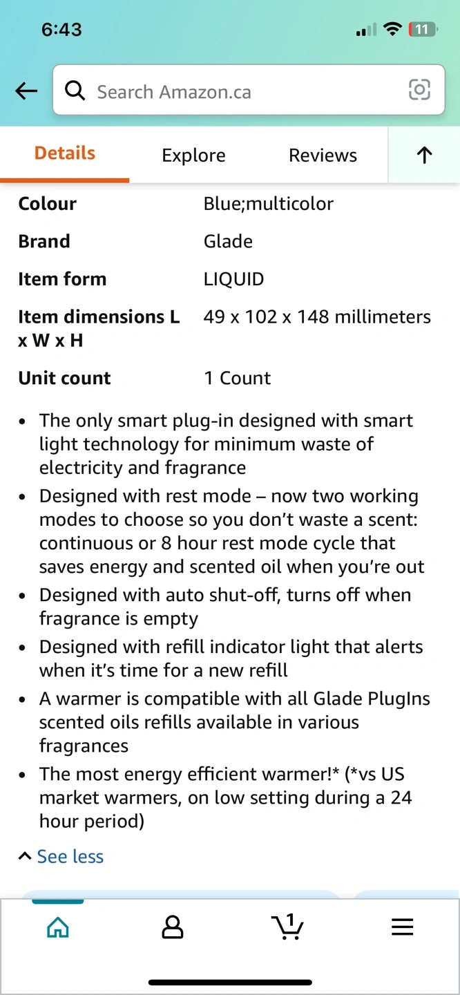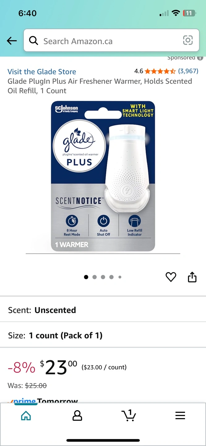 10Keep your home smelling fresh with this Glade Plugin Plus scented oil warmer! It features smart light technology to minimize energy waste and fragrance. - 8-hour rest mode - Auto shut-off - Low refill indicator Works with your favourite Glade Plugins refills - Includes one refill (unsure of scent) Retails for $25+tax ($28.25) for warmer only