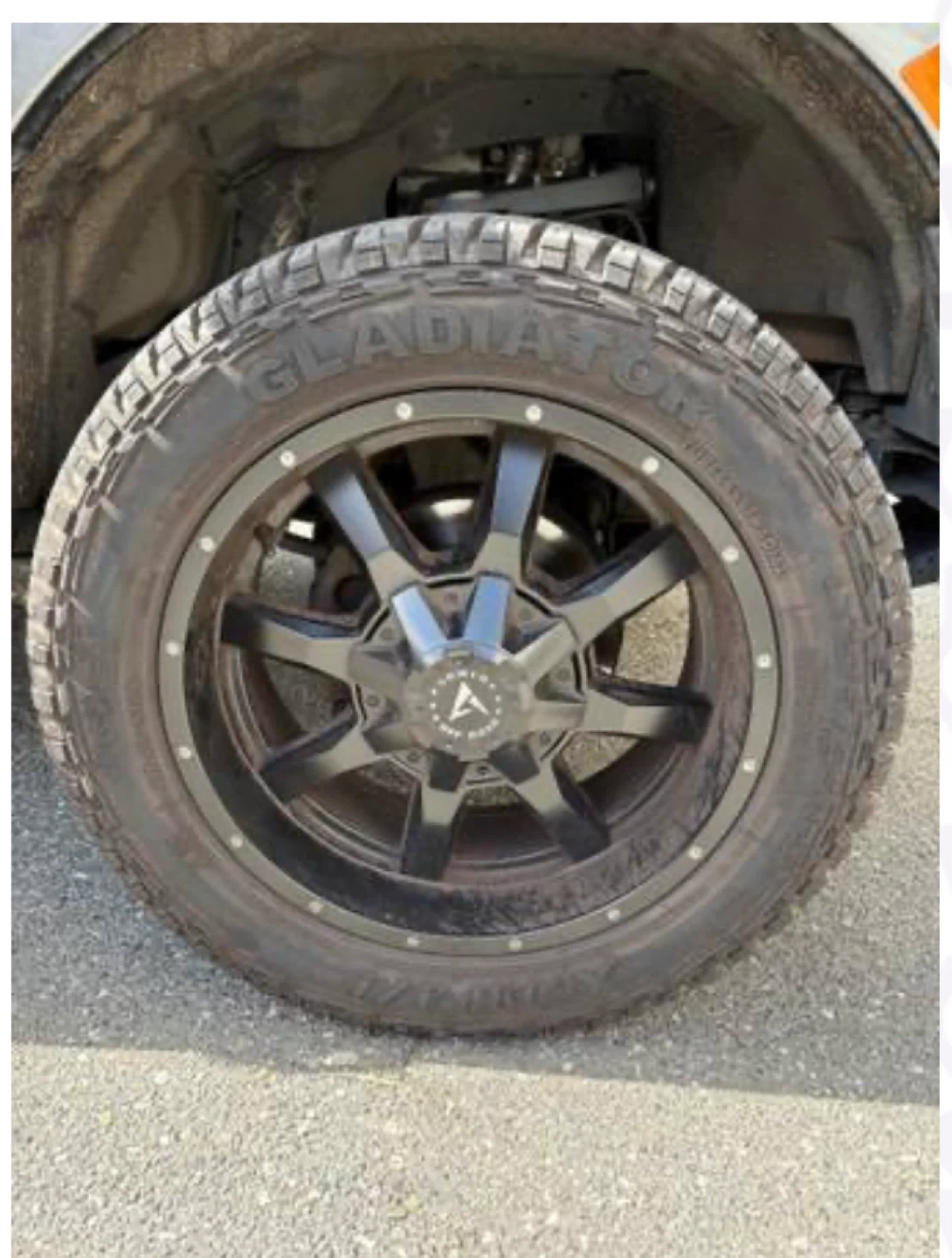 10Tires : 275/55/20 gladiator x comp A/T M/S all season tires Rims - armed frontline satin black 20x9 multi bolt pattern : https://armedwheels.com/861-frontline-mb Have a 1.5” offset (pokes out the side from front view inch and a half) I had these wheels on my ford ranger which is 6x139.7 bolt pattern, but these rims are multi bolt pattern - you can see in one of the photos with the cap removed - here is a website with the bolt patterns it can work with : https://armedwheels.com/861-frontline-mb, Specifications in Satin Black - total of 7 different bolt patterns. There’s a photo which has all the bolt patterns that these wheels work with as well. For example it works with 5x139.7, 6x139.7, 8x170, and a couple more. I bought these tires November 2024, they got 8 months of use and have like 90% + tread left. Cost me 2500, looking for 1500. Pretty hard on price as these are borderline brand new and have next to no scratches, just dusty from being in stored in garage. You can also google Armed Frontline 20x9 multi bolt pattern and it’ll tell you the details. Works with Ford, GMC, Dodge, Chevy , Toyota.