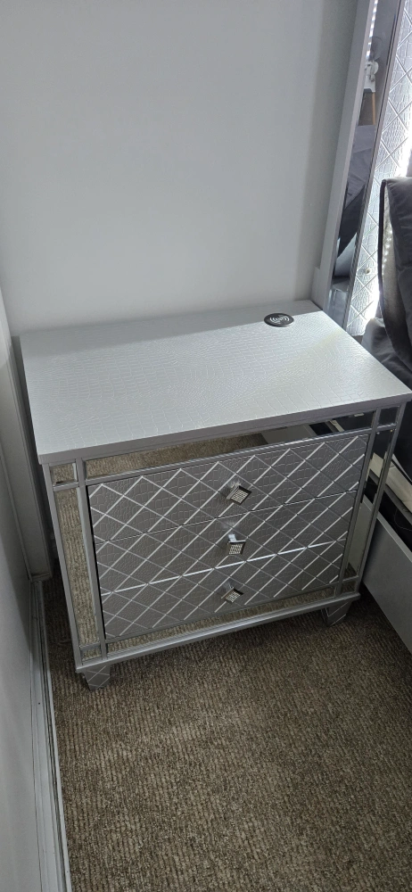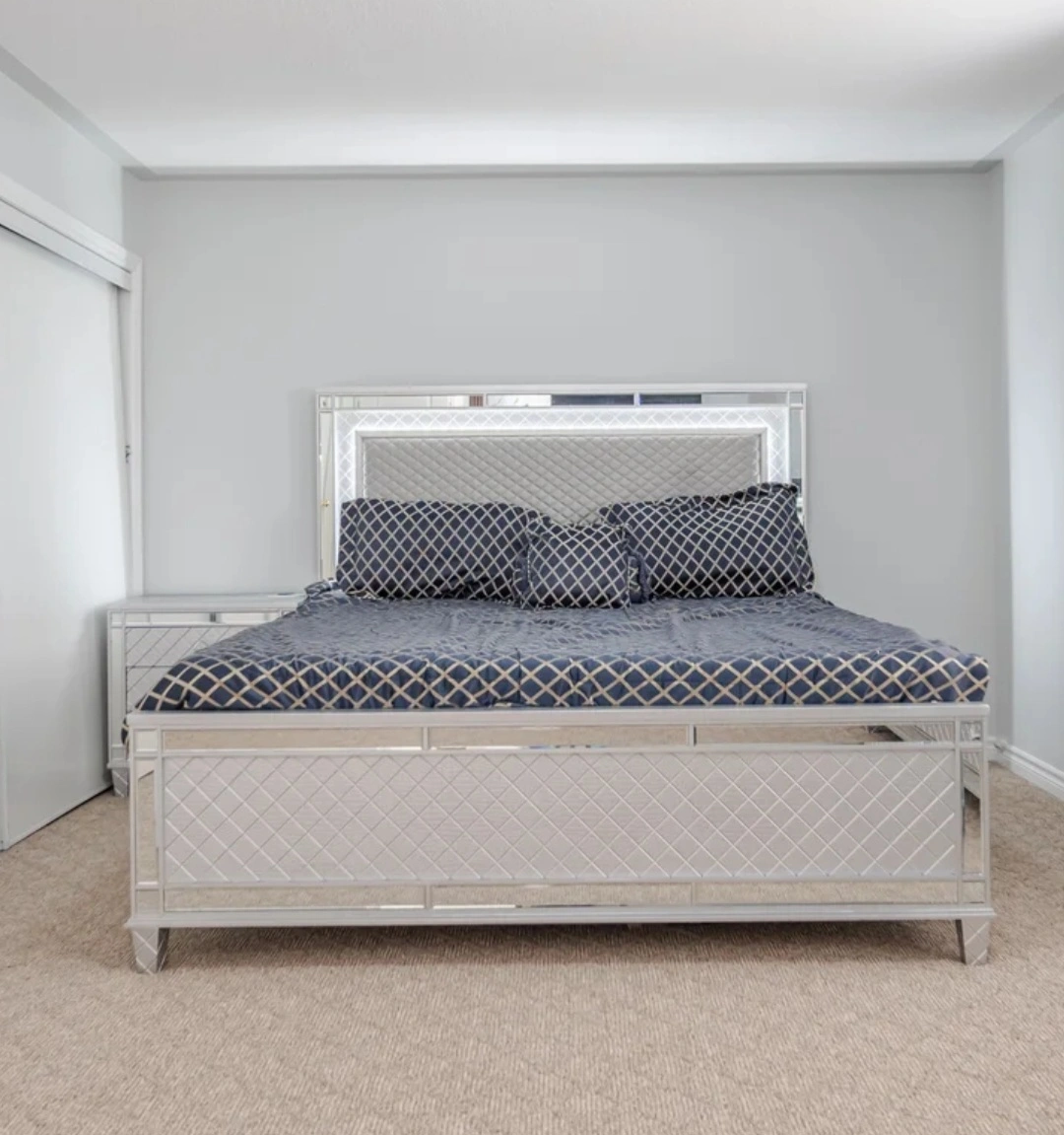 Selling a glam bedroom set! Includes a bed frame, dresser, and nightstand. All pieces have a mirrored finish and a quilted pattern. The bed frame is a light grey colour and has some wear on the footboard. Dresser and nightstand are in great condition. Perfect for adding a touch of sparkle to your bedroom! it's come with mattress, 2 mattress box the bed frame and dresser and one night stand it ia good condition but it just little rip on bed frame selling as is the bes is king size