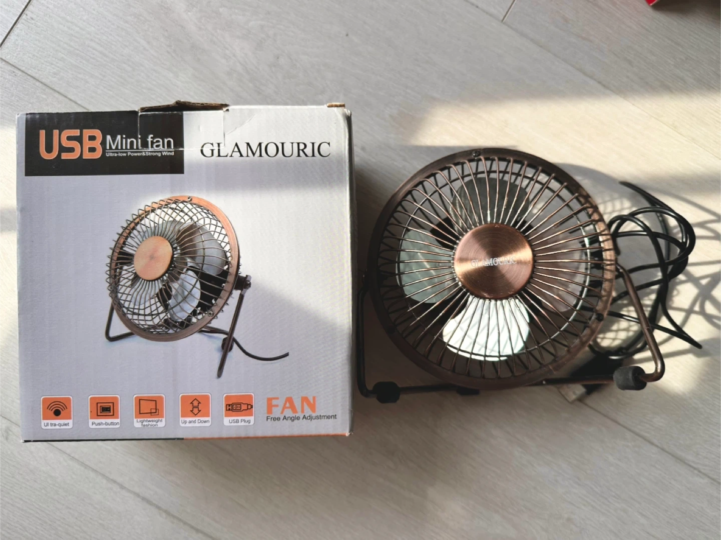 Selling a Brand New GLAMOURIC USB mini fan! It features an ultra-low power design with a strong wind output. It's super quiet, has a push-button control, and is lightweight and portable. You can adjust the angle freely, and it uses a standard USB plug. Comes with the original box