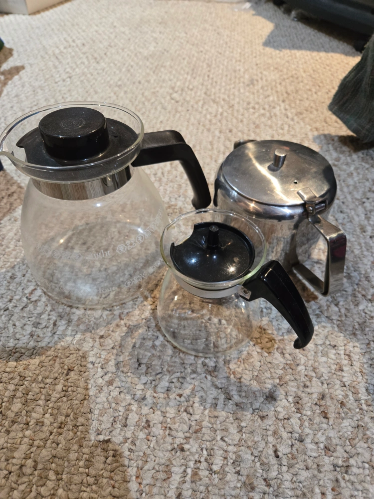 843Set of three teapots. Two are glass with black plastic lids and handles. One is stainless steel. All are in good condition.