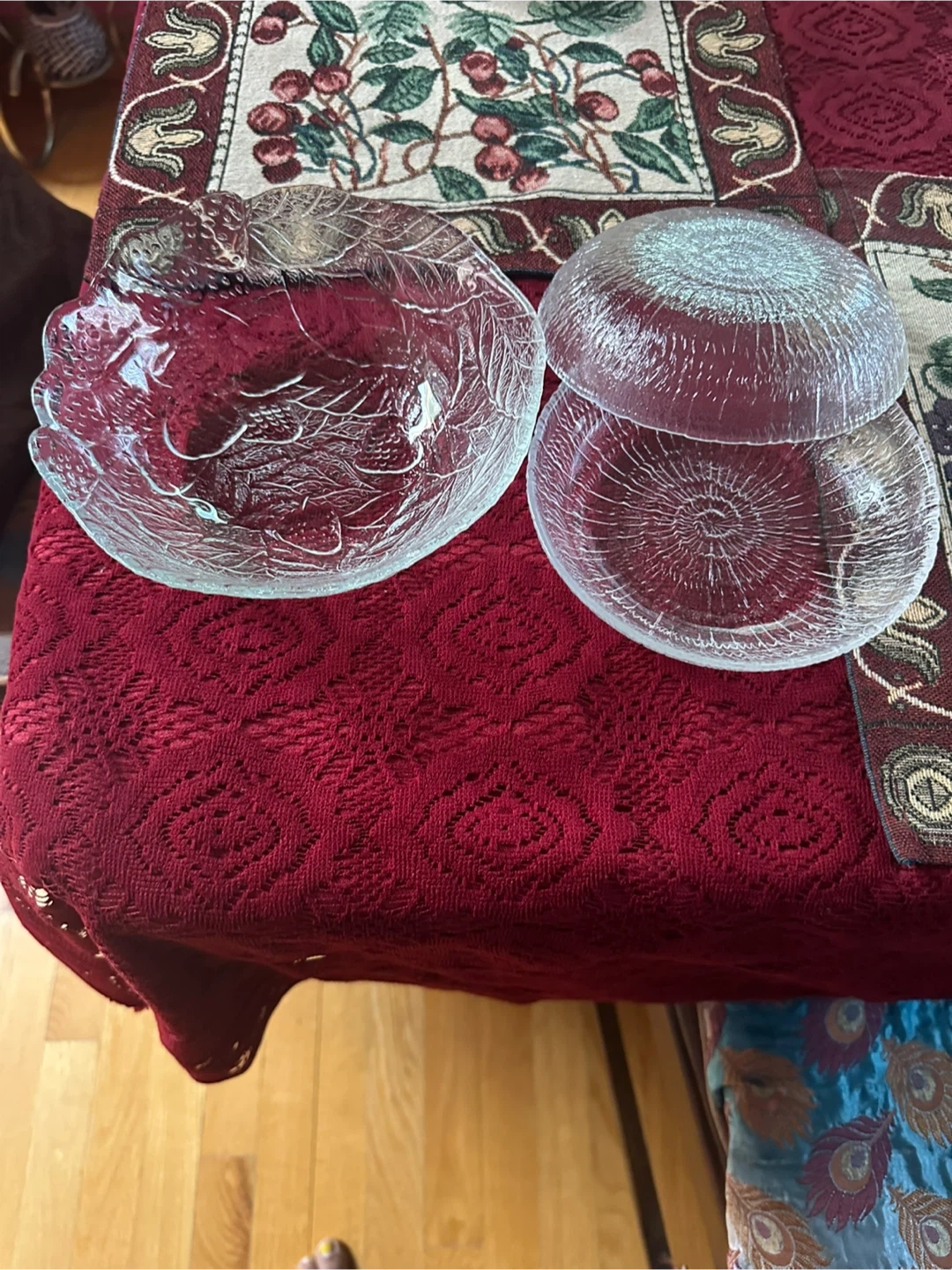 70Selling a set of clear glass bowls. One bowl has a lovely leaf design, while the other two are stacked together and have a textured pattern. Perfect for salads or desserts!