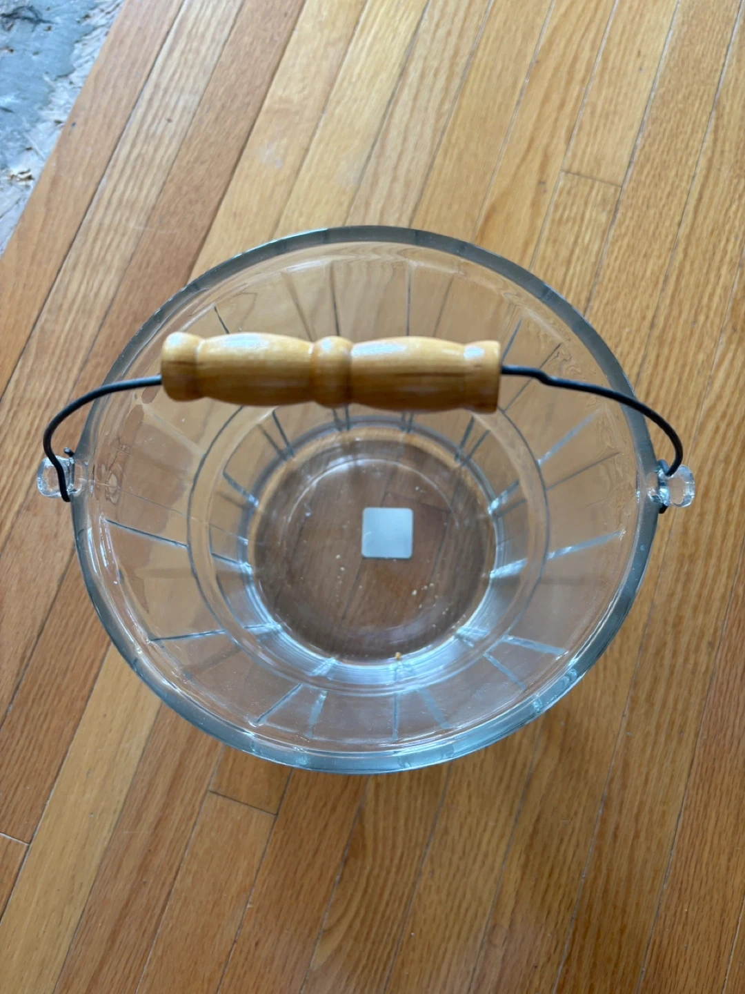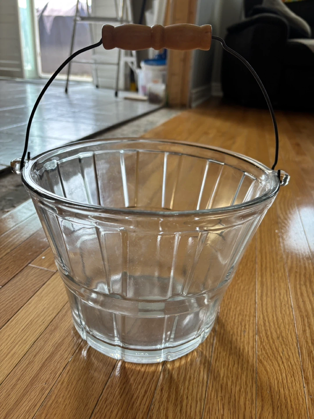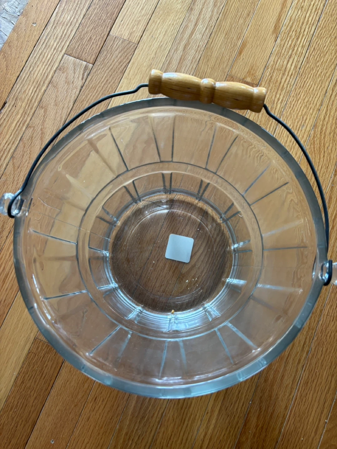 34Selling a clear glass bucket with a wooden handle. It's in great shape and ready to use!