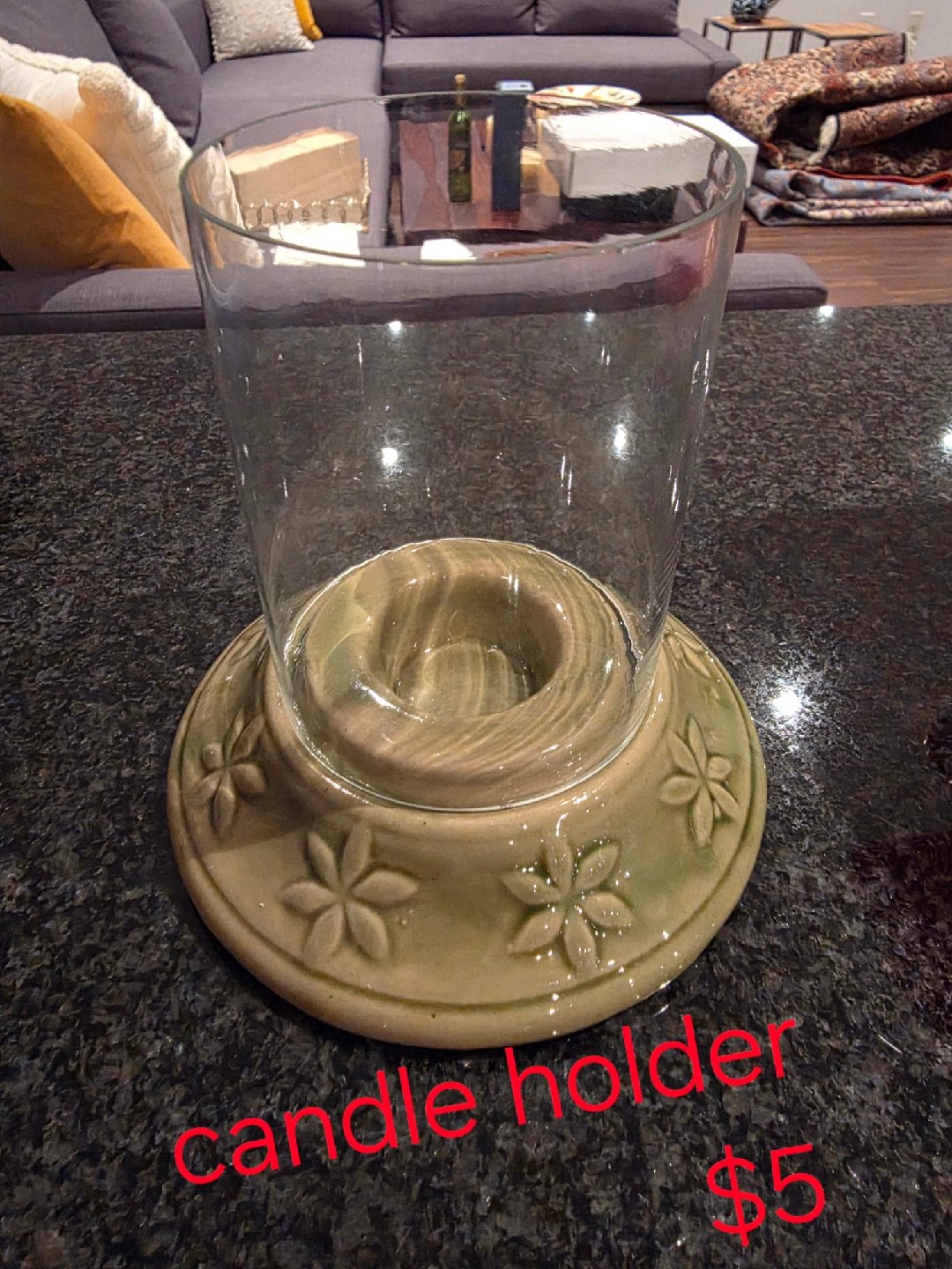 82Selling a glass candle holder with a ceramic base, adorned with flower designs. Also, six dolphin-stemmed glasses are available. Great for adding a touch of whimsy to your table setting. 3 sets of 6 . each set for $30
